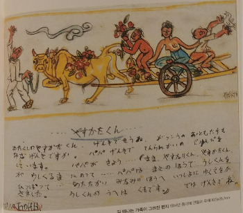 나의 태현아 건강하겠지. 너의 친구들도 모두 건강하니? 아빠도 건강하다. 아빠는 전람회 준비에 몰두하고 있다. 아빠가 엄마, 태성이, 태현이를 소달구지에 태우고 아빠가 앞에서 황소를 끌고 따듯한 남쪽 나라로 함께 가는 그림을 그렸다.