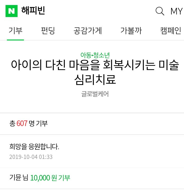 아주 작은 기부이지만 모든 사람들의 기부가 생활화가 되면 우리나라도 선진국가 부럽지 않은 나라가 될 것이다. 누군지는 모르지만 미술치료를 받는 청소년들이 마음을 열고 자신의 감정을 공유할 수 있는 여유가 있어지길 바라며...