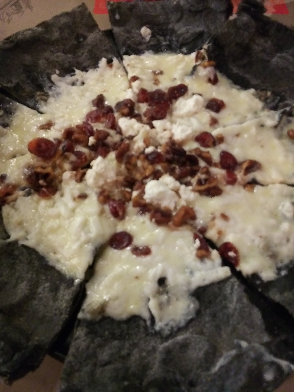 처음 먹었을 때는 너무너무 신기했는데, 이제는 감흥이 없는 게 사실이다. 그냥 가격에 맞춰서 주문했을 뿐이다. 먹물 도우에 크림치즈와 견과류 크린베리류가 있는데 일반적인 피자맛은 아니고 산뜻한 맛이라고나 할까?ㅎㅎ