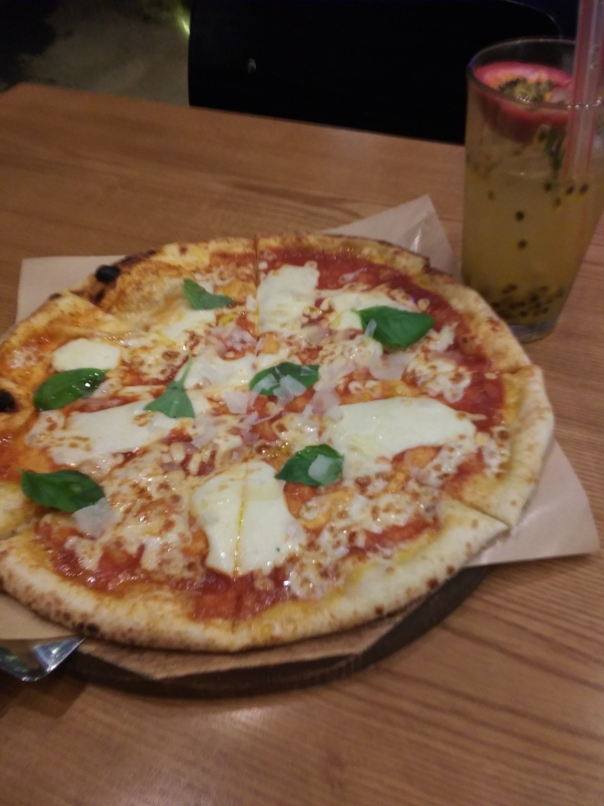 불을 붙이고 난 다음에 가위로 반을 자르면 아래와 같은 피자 단면이 나오고 뚜껑 같은 애는 그냥 도우다. 꿀을 비롯한 3가지 소스가 제공되어서 거기에 찍어먹어도 되지만 배불러서 뚜껑은 그냥 포장해오는 편이다. 나중에 집에서 수프를 끓여서 찍어 먹거나 하면 된다.