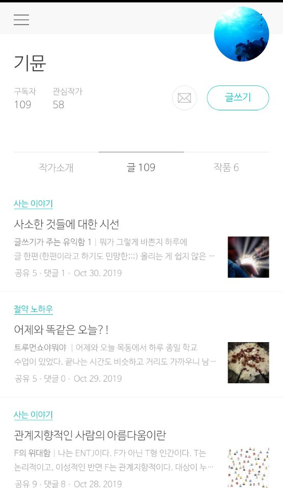 109명의 구독자가 모두 나의 글을 읽어주시는지, 지나가던 분들이 읽어주시는지 나는 알턱이 없다. 그렇지만 한자리 수였던 구독자가 브런치를 시작한 지 90일이 되어가는 오늘 109명으로 늘었고, 어떻게 뭘 써야 할지 몰랐던 나도 의식적인 노력을 통해서 109개의 글을 썼으며 이 글이 추가되면 110개로 2019년 10월을 마무리하게 된다. 물론 꼭 숫자의 크기가 중요한 것은 아니다. 하지만 양이 질을 이길 때까지 나는 그냥 노력할 뿐이다. 이런 핑계 저런 핑계를 대다 보면 하지 않을 이유야 수두룩하므로 그냥 핑계 대지 않고 매일 하는 것을 해보는 것뿐이다. 하지 않은 채 변명을 하는 사람보다는 그래도 최선을 다해서 일단 해보는 사람이 되어보고자 하는 것뿐이다. 그러므로 힘들어도 그냥 하면 된다. 그게 그렇게 죽을 만큼의 힘든 것은 아니지 않은가. 조금만 신경 써서 시간을 관리하면 되고, 조금만 더 의미 없는 곳에 마음을 두지 않으면 할 수 없는 경지도 아니 니말이다.