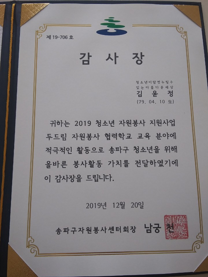 어쨌든 나도 얼떨결에 시작한 자원봉사활동이었는데 1년동안 열심히 출강을 했다면서 상을 주신다고 한다. 사실 직접적으로 청소년들을 만나서 여러 가지 이야기를 한 것도 좋았고, 오고 가며 선배님들이 학교생활과 여러 가지에 대해 조언해주시는 것들도 좋았다. 그래서 내가 받은 게 더 많은 활동이 아니었나 싶다.
