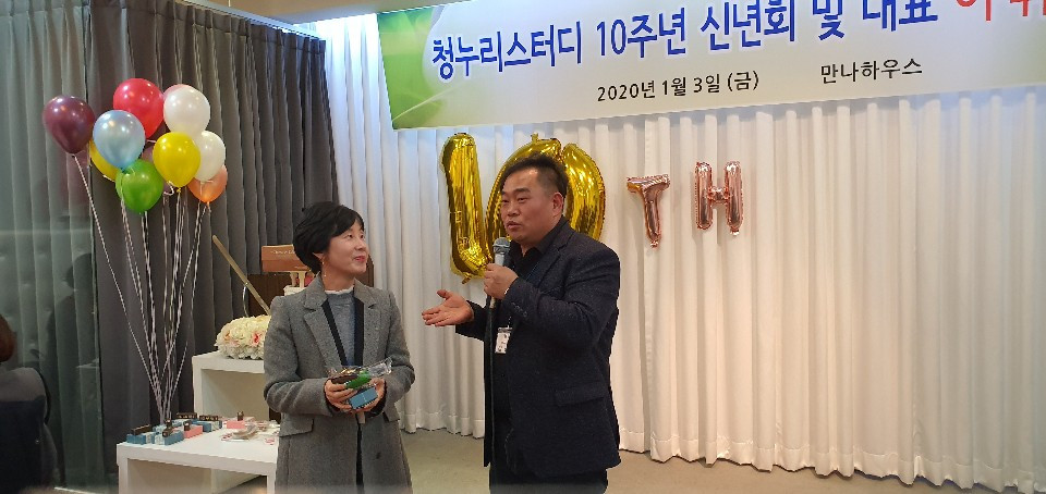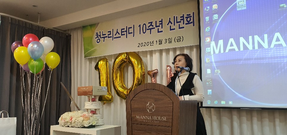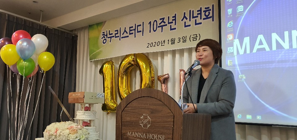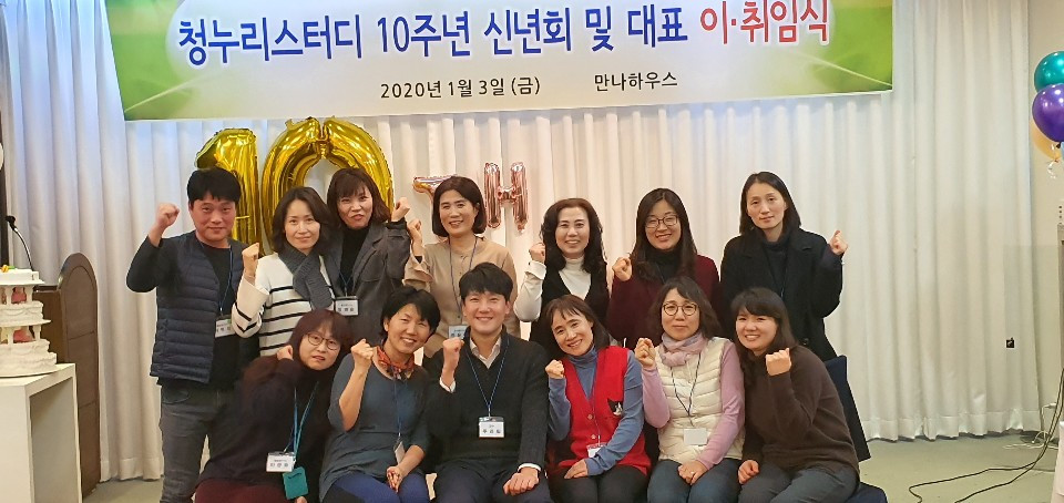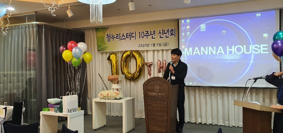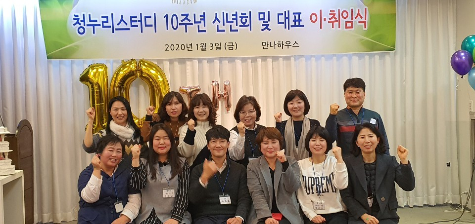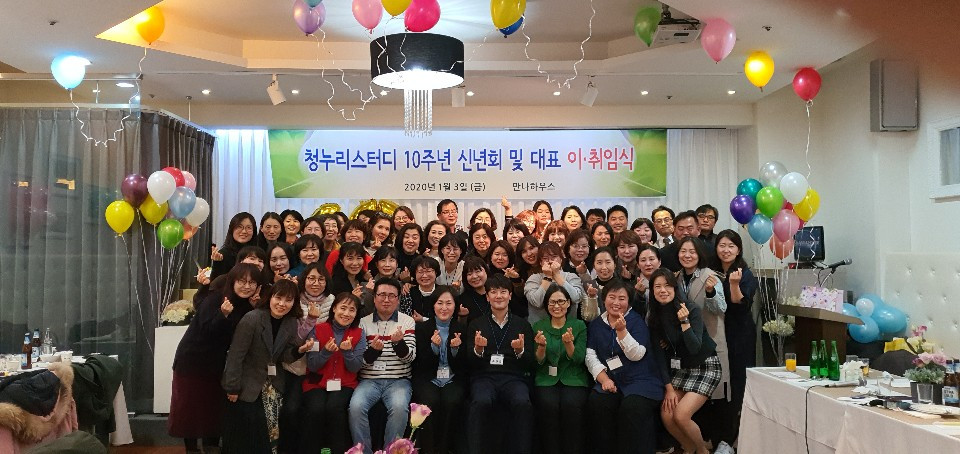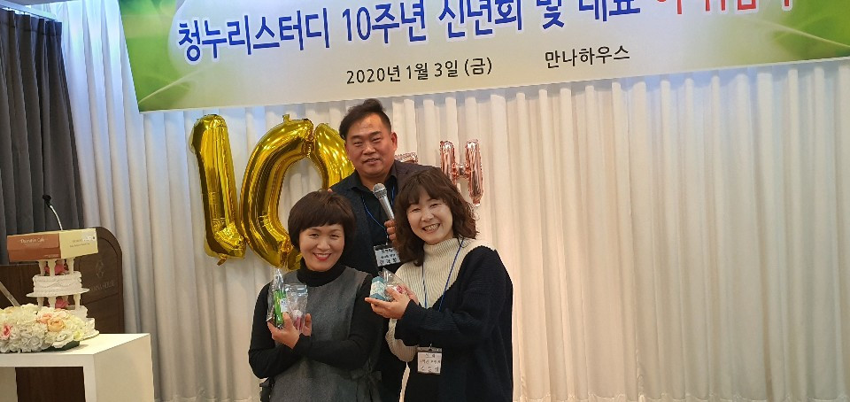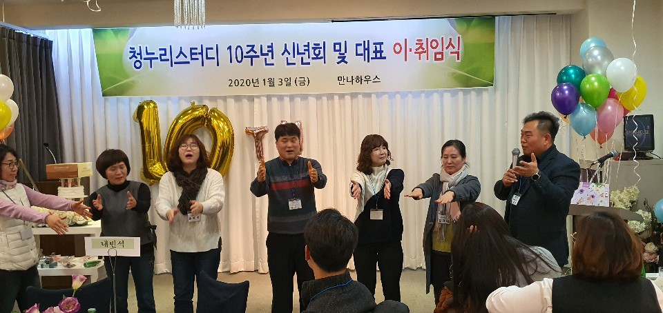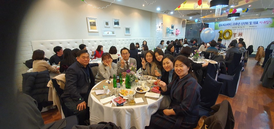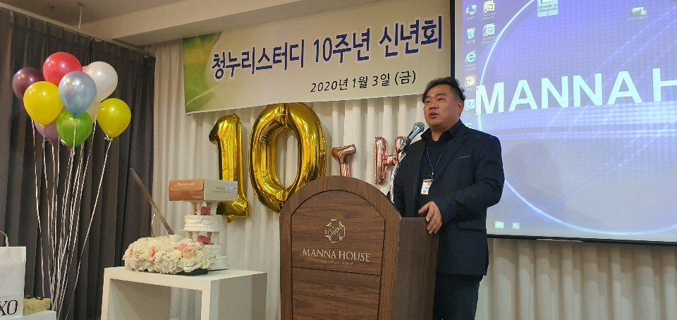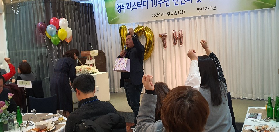 2019년 1월 3일 금요일 스터디 10주년을 맞이하여 교수님과 1기부터 10기까지 오랜만에 모두가 모여 신년회를 함께했습니다. 누구의 회갑이나, 돌잔치가 아니라"청누리 스터디의 10주년"입니다. 사회는 아나운서 학원 출신의 이경숙 부대표님께서 맡아주셨습니다^^