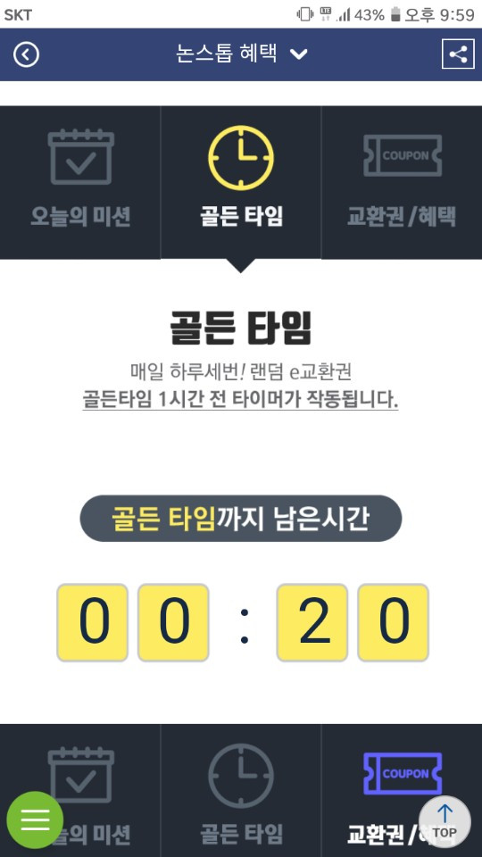 골든타임이 20초 남은 상황이다. 22:00이 되어서 딱 눌렀을 때 500원 혹은 1000원의 e 교환권의 발행되는데 어제는 다행히도 1000원의 교환권이 나왔다.