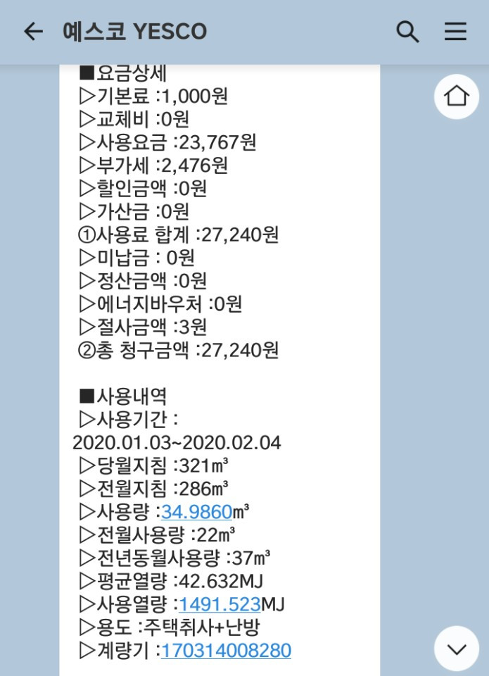 카톡도 되도록 빨리 확인하고 빨리 삭제하는 편인 나인데 유독 확인하기가 두려운 카톡이 있다. 무슨 카톡이냐면 "도시가스 요금" 카톡이다. 그렇게 많이 트는 편은 아니지만 그래도 매달 폭탄을 맞았을까 봐 떨린다. 다행히 이번 달은 27,240원으로 폭탄요금은 아니었는데, 이 카톡을 클릭하기까지는 어찌나 두근두근거리던지 ㅋㅋ