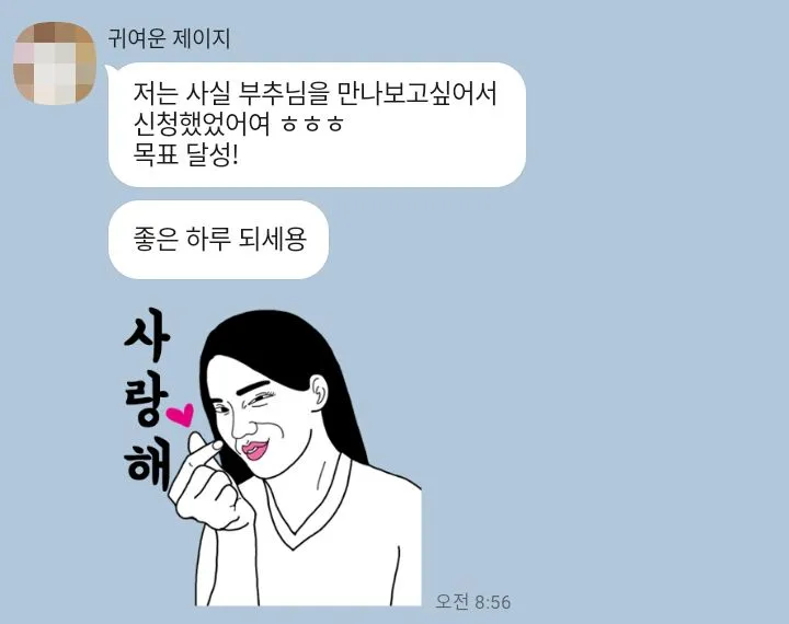 새벽 운동을 하고 일찍 출근해서 책을 읽거나 글을 쓰면 기분이 좋은 반면 다소 늦게 출근하는 날은 뭔가 시간을 낭비한 기분이 들었다. 그러나 그만큼 더 꿀잠을 잤고, 간단히 아침도 해결했으며 짧은 강의를 틀어놓은덕분에 영감도 얻었다. 그럼에도 불구하고 날씨의 탓인지, 기침이 자꾸 나와서인지 어깨가 축 처져있었는데 뜬금없는 이 카톡이 나를 웃게 만들었다