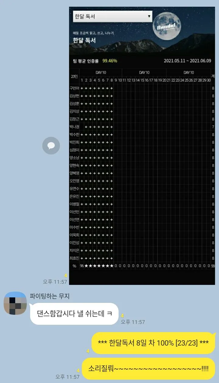 하루중 본인이 원하는 시간에 책을 읽고 글을 써서 인증하면 미션 클리어인데 23:59가 마감이다. 24:00가되면 다음날로 인식되므로 23:59까지 미션을 클리어해야한다. 누군가는 아침에 인증을 하는 루틴이 있고, 누군가는 23:00가 넘어서야 본인의 시간이 겨우 주어질수도 있다. 각자가 본인의 미션을 이루는것이고 그것을 챌린지하는것이지만 팀미션이기도하다. 인증이 완료된 사람은 별표시가 되고, 인증을 하지 못하면 빈칸으로 남게되는데 팀원 전원이 올인증을해서 별로 가득 채워지는것을 나는 "왕별"이라고 부르기 시작했다.