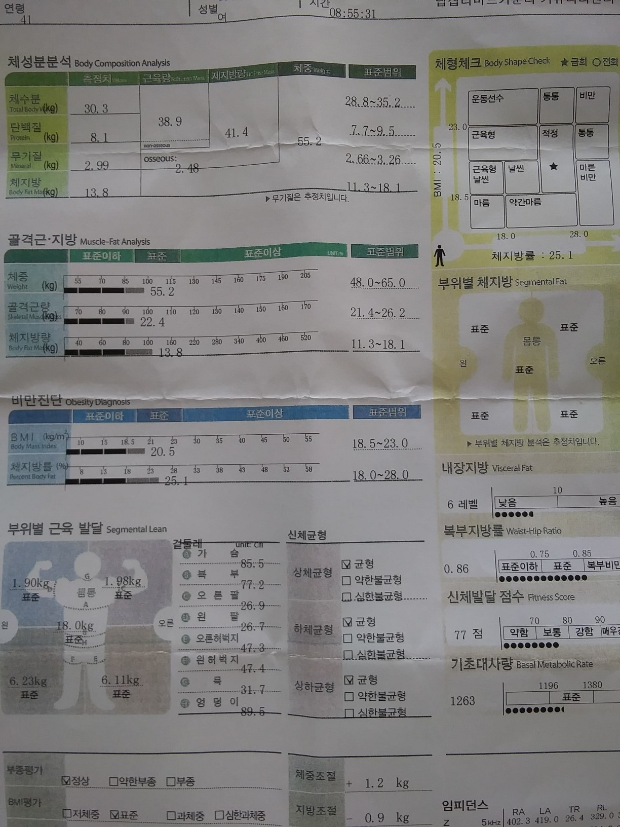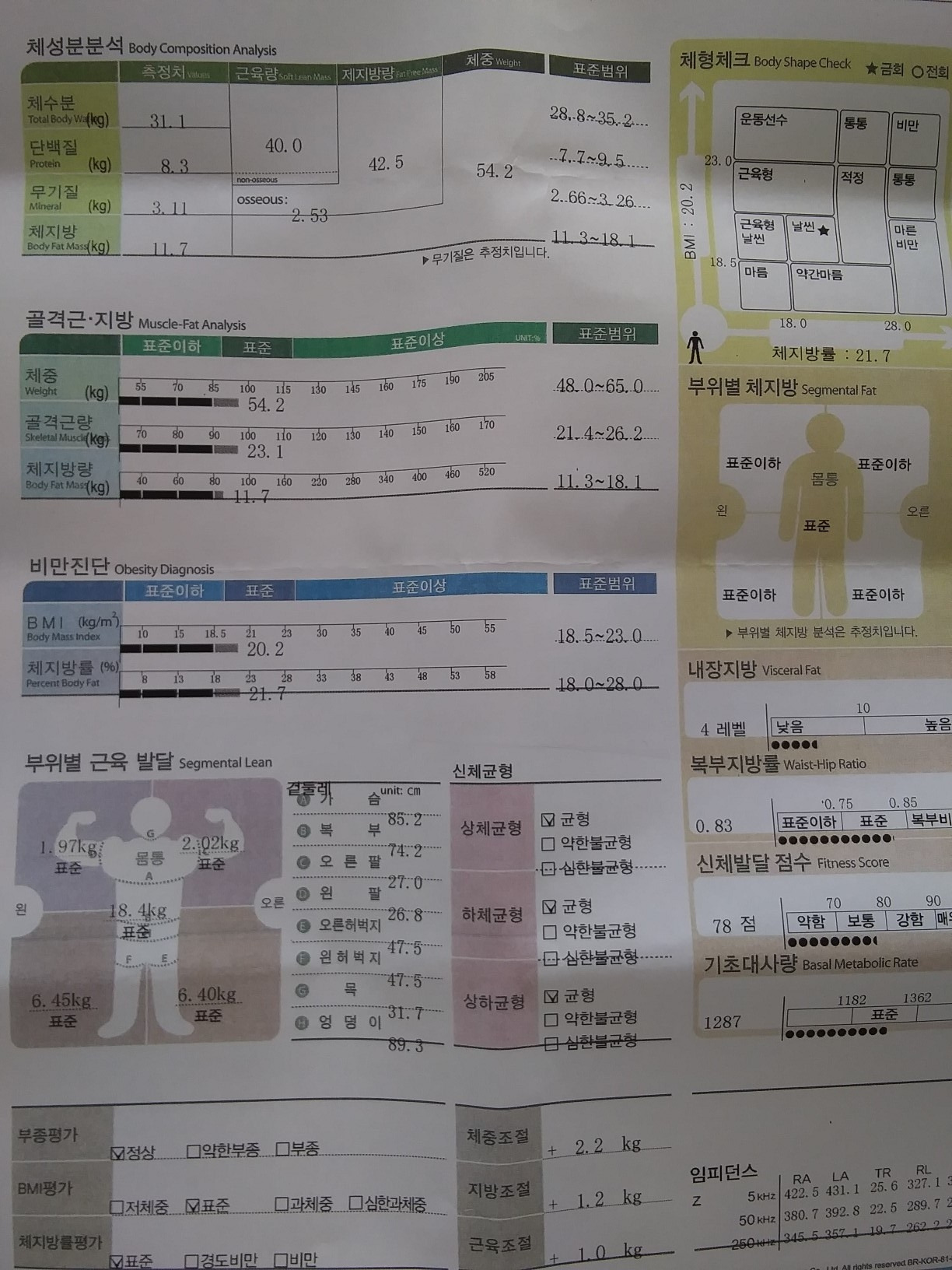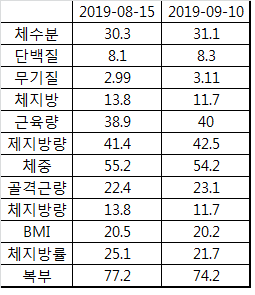 사실 개인 PT를 받는 게 아니라서 인바디를 출력하게 조금 눈치 보였다. 운동 시작 후 열흘째인 8/15(목)에서야 인바디를 체크한 게 아쉽긴 하지만, 그래도 운동 시작한 지 한 달이 넘었으므로 중간 점검을 해보기로 한다.