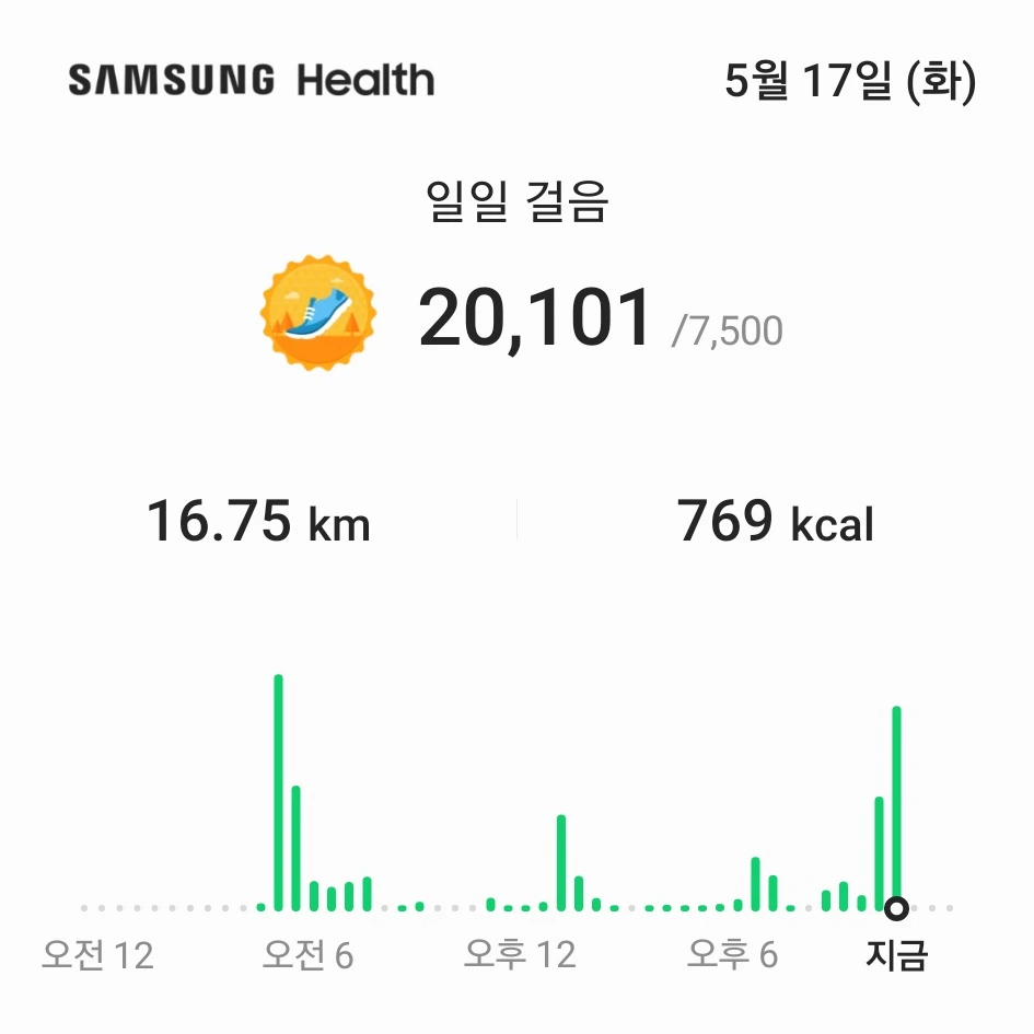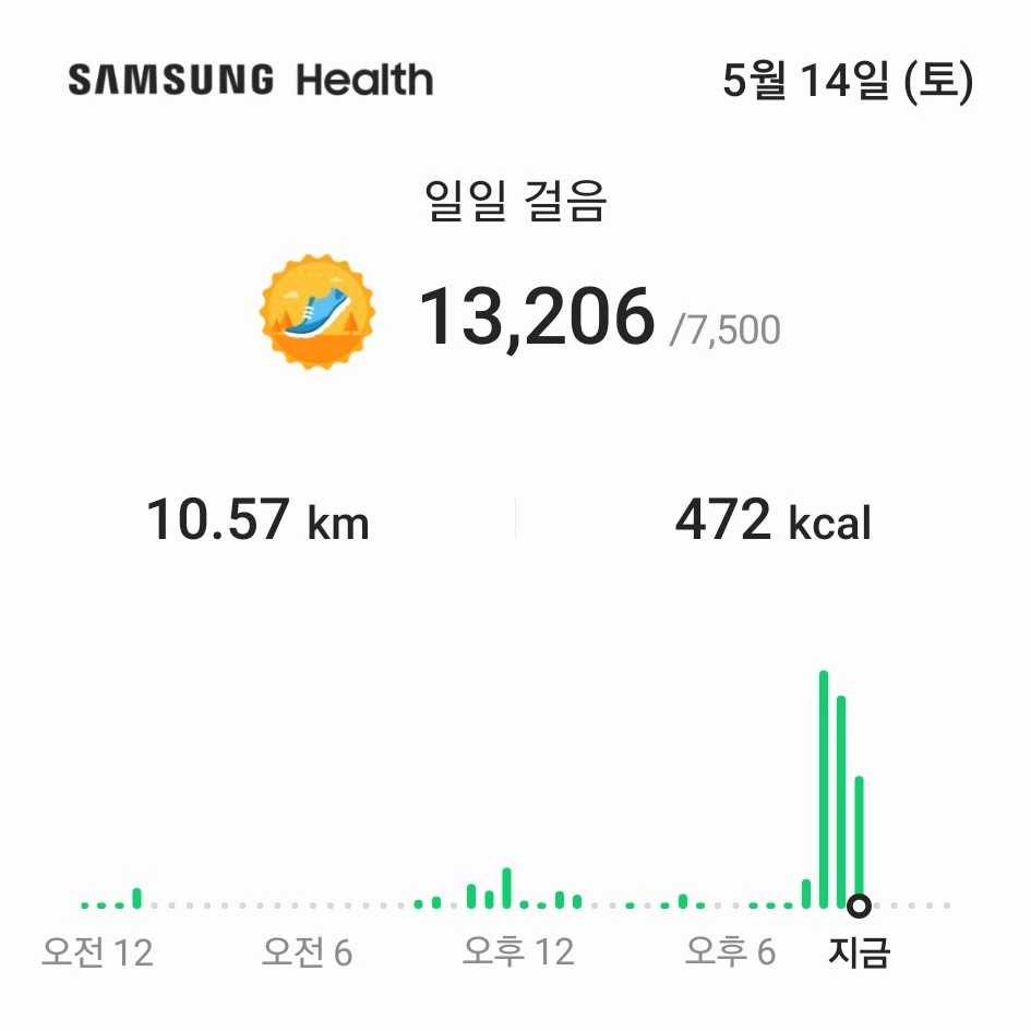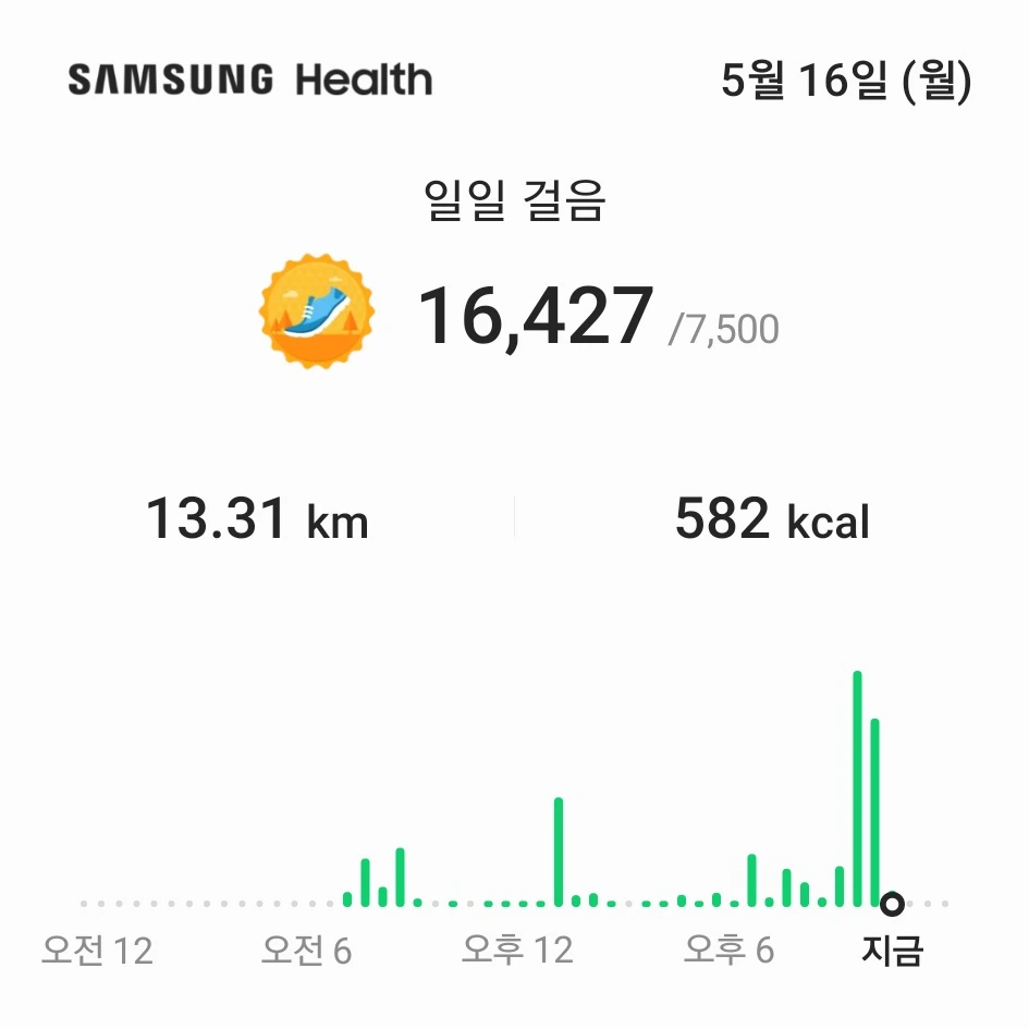 삼성 헬스 앱의 하루 목표를 7,500보로 설정해두었다. 원래 10,000보였다가 줄인 이유는 부담을 갖지 않기 위해서다. 바쁜 날은 저녁에 필라테스만 갈 수도 있고, 여러 가지 변수가 있다 보니 굳이 목표를 높게 설정해서 스트레스를 받을 이유가 없었다. 7,500보로 설정해두고 아침에 달리기를 하면... 거의 5,000보에 가깝게 되고, 본의 아니게 출퇴근을 하면서 걸을 수밖에 없는 구조이다 보니 출근하면 어느새 "목표 달성을 축하합니다!!!"라는 메시지가 뜬다.