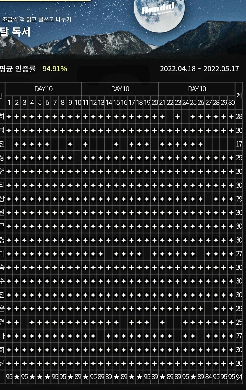 혹시라도 책과 친하지 않아서, 글을 써본 적이 없어서 고민이라도 고민할 이유가 없다. 처음부터 독서가 쉬운 사람 없고, 처음부터 글 잘 쓰는 사람도 없다. 나도 바닥부터 시작해서 지속하고 있을 뿐이고, 모르면 배우면 그만이다. 고민을 하고, 겁을 먹고, 할까 말까 갈팡질팡 할 시간에 그냥 도전하는 게 낫다. 동기 부여하면 떠오르는 이 부추 방장이 알아서 케어해드릴 테니 겁먹지 마시고 21기 한달독서와 한달쓰기에 도전하시기를!!! 완주율 94%의 팀원들과 이 부추방장을 믿고!