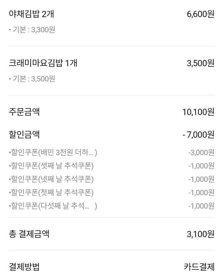 이렇게 해서 10,100원에서 7,000원 할인받고 3,100원에 결제를 했다.