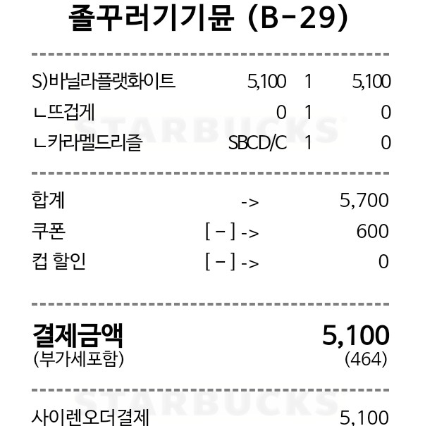 바닐라 플랫화이트 Tall은 5,600원이지만 Short도 해당되므로 5,100원을 선택한다.