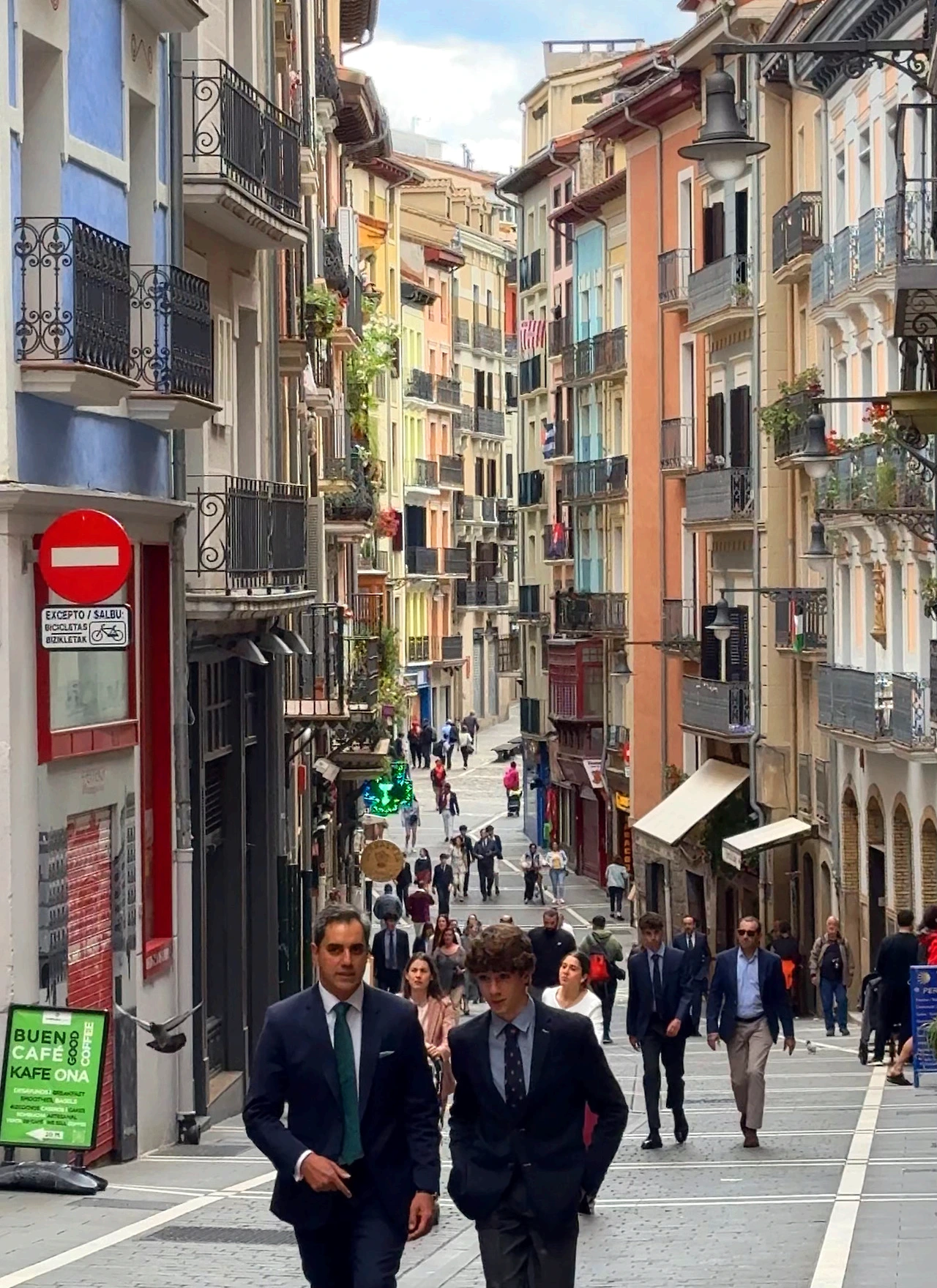 한국에서 만날 수 없는 광경들로 당황했지만 이건 시작이었다. 샤워를 마치고 아픈 무릎을 위해 보호대를 사기로 했다. 마침, 근처 순례자 용품점에 괜찮은 제품이 있어 샀다. 바로 착용을 하고 시내 구경에 나섰다. 팜플로나는 마치 내가 중세 시대에 온 듯한 착각을 하게 만들었다. 틈 없이 다닥다닥 붙은 건물들과 돌로 된 길, 좁지만, 층마다 있는 예쁜 발코니, Bar에 앉아 커피나 맥주를 마시는 사람들의 왁자지껄한 목소리. 광장을 둘러싼 Bar의 테라스 좌석엔 이미 빈자리가 없었다. 스페인 사람들은 광장과 Bar를 사랑한다.
