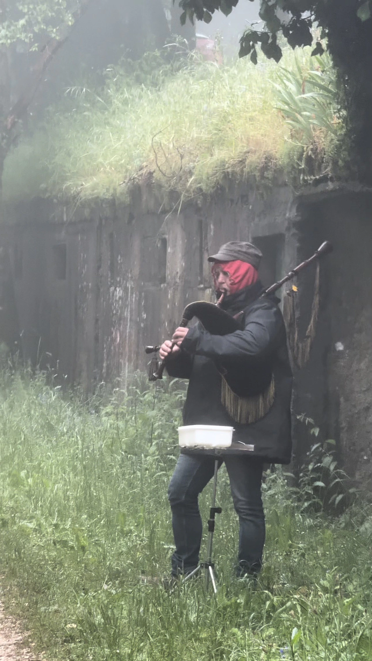 나 역시 ‘오 세브리오’까지 마지막 오르막길이 남아있었다. 오늘은 그곳을 지나 계속 내리막길을 걸어 ‘트리아카스텔라’까지 가는 여정이었다. 일기예보는 오전 중 맑아진다고 했다. 난 더워지기 전에 출발하기 위해 서둘렀다. 상당한 고지대였지만 안개로 인해 풍경을 볼 수 없는 것이 조금 아쉬웠다. 꿈속처럼 몽환적인 분위기의 산길을 한참 동안 말없이 걸었다. 그때 어디선가 악기연주 소리가 들렸다. 조금 더 걸어가니 성벽 같은 곳에 백파이프 연주자가 보였다.