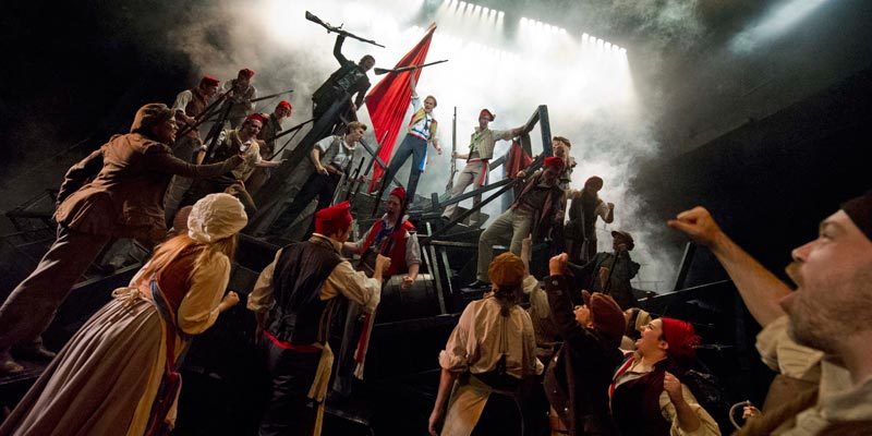 거대한 두 개의 로봇이 마치 영화 트랜스포머에 나오는 자동차들처럼 변신하며 장면을 바꾼다. 파리의 뒷골목이 순식간에 혁명군의 바리케이드로 변한다. 당시로선 획기적인 아이디어와 기술로 연출된 무대는 세계를 놀라게 했다.