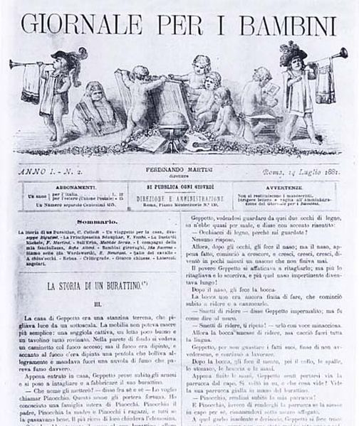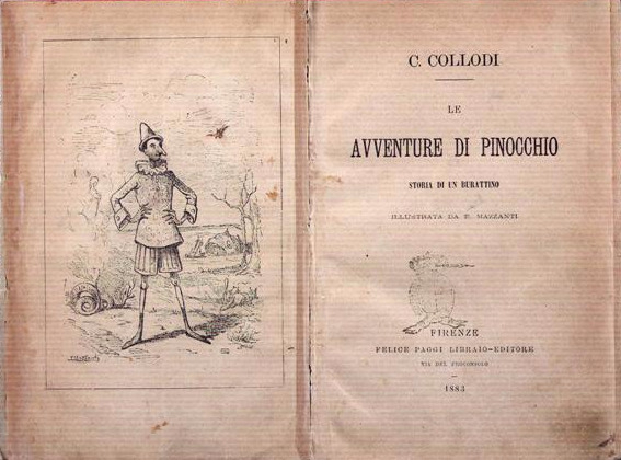 1881년부터 1883년까지 3년간 큰 인기를 얻으며 이탈리아 최초의 어린이 신문인 로마의 '아동신문Giornale per i bambini'에 연재된 이 이야기는 1883년 '피노키오의 모험Le avventure di Pinocchio'이라는 제목으로 출간된다. (디즈니가 장편 애니메이션으로 제작한 1940년은 저작권이 만료된 해이다. 디즈니는 마치 저작권 만료일을 기다리기라도 한 것처럼 피노키오를 영화로 만든 셈이다.)