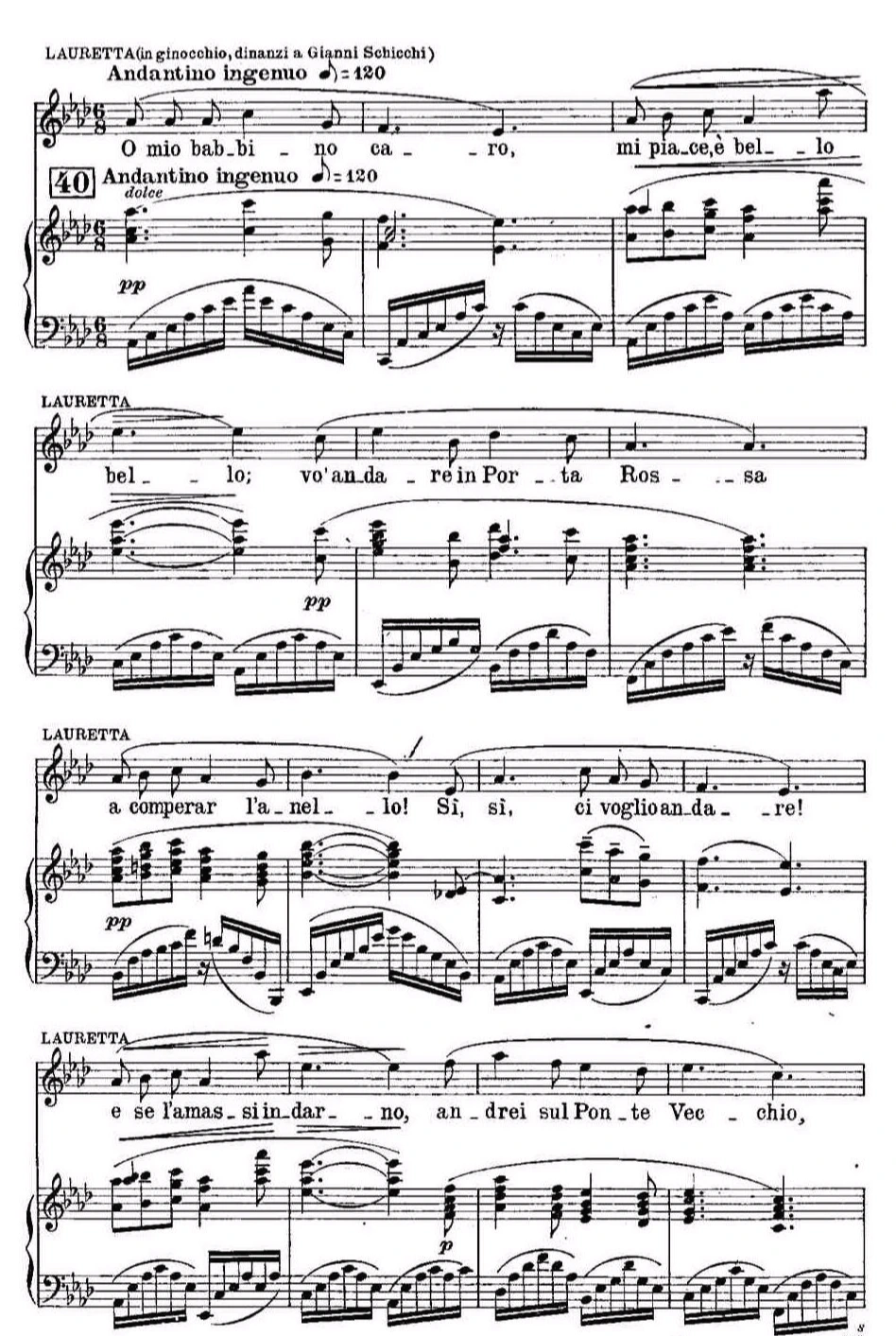 라우레타가 사랑하는 리누치오Rinuccio와 결혼을 할 수 없다면 다리에서 강물로 뛰어들겠다고 호소 아닌 호소를 하는 이 노래는 연주시간 3분이 되지 않는 비교적 짧은 아리아다. 단막 오페라 쟈니 스키키가 총 연주시간 1시간 정도라는 점과 아리아라고 할 만한 곡이 몇 곡 되지 않는데다가 대부분 3분 내외라는 점을 생각하면 당연한 것 같기도 하다.