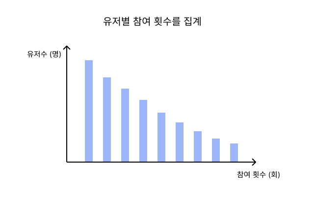 충성 고객의 구매 패턴을 보면 그 힌트를 얻을 수 있습니다. 저는 자사 서비스 구매 참여 횟수에 따른 유저 분포도를 통해 분석을 진행해 보았습니다.