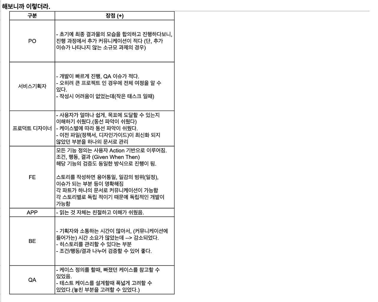 각 기능 조직들에서 생각한 점은 위와 같았다. 물론 장점만 존재한 것은 아니었다. 유저스토리에 너무 세세하게 디자인까지 정의할 경우, 프로덕트 디자이너의 역할과 범위가 좁아지게 되고. 동선을 잘 못 기술했을 경우 QA에서 작성하는 TestCase에 혼란을 줄 수도 있다.