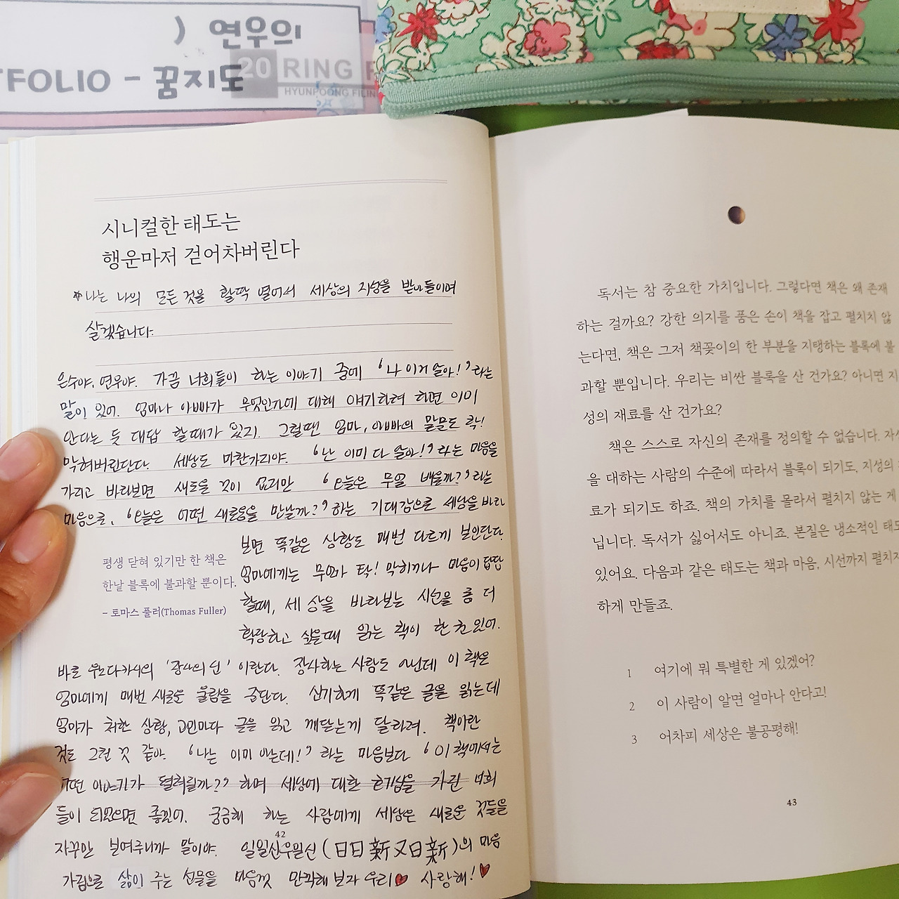 엄마가 너희에게 딱 하나 무엇이든 선물해 줄 수 있다면, 엄마는 '호기심'을 선물해 주고 싶어. 호기심 어린 눈으로 삶을 바라보면 생각보다 많은 보물들이 숨어있단다. 보이지 않던 것들도 눈에 쏙 들어오게 만들어주는 렌즈가 바로 '호기심'이야. 주어진 대로 사는 사람보다, 삶이 나에게 주려는 의미가 무엇일까 궁금해하는 사람에게 세상은 새로운 것들을 끊임없이 보여준단다. 그렇게 삶이 주는 선물을 마음껏 만끽하는 우리가 되었으면 좋겠어.