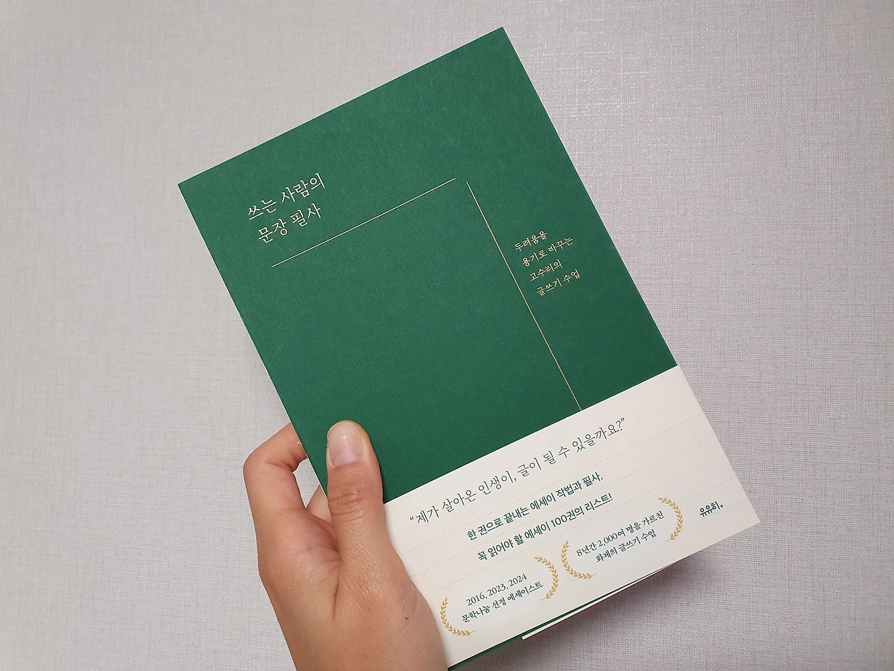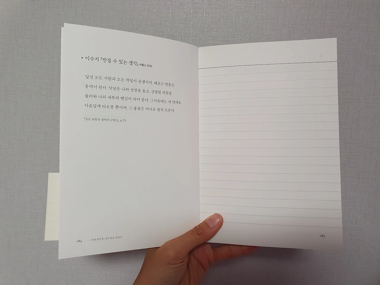 이번에 필사할 책으로 선정한 책은 고르고 고르고 고르고 고른?! 고수리 작가님의 '쓰는 사람의 문장 필사'입니다. 고수리 작가님의 책에는 총 100개의 글이 담겨 있어요. 챕터마다 글쓰기를 응원하는 마음들이 함께 담겨있어서 읽기에도, 쓰기에도 참 좋은 책입니다. 실제본 책이라서 쫙쫙~ 펴지고요 무엇보다 필사할 공책을 따로 살 필요가 없어요. 책 한 권에 오롯이 필사할 문장과 나의 필사가 함께 담긴답니다.