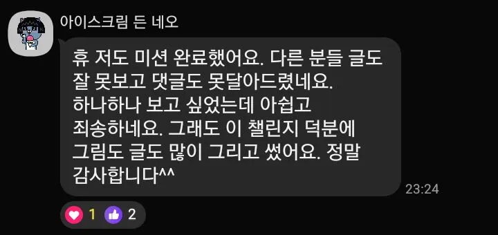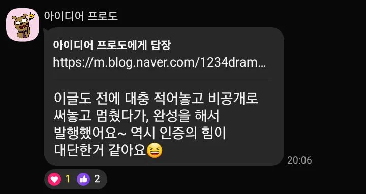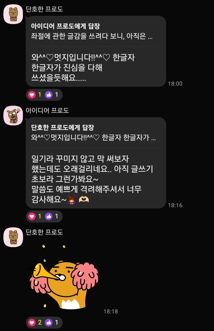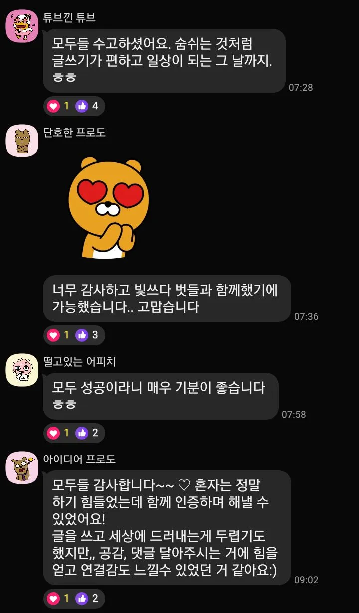 1️⃣ 인증 기간 동안 단체 카톡방을 운영합니다. 단톡방에 내가 쓴 글을 공유하고 글정을 나누어요.