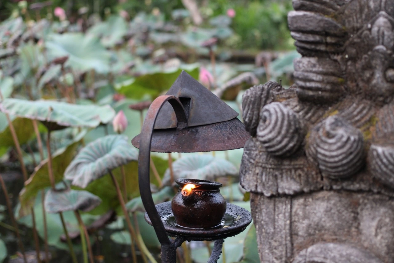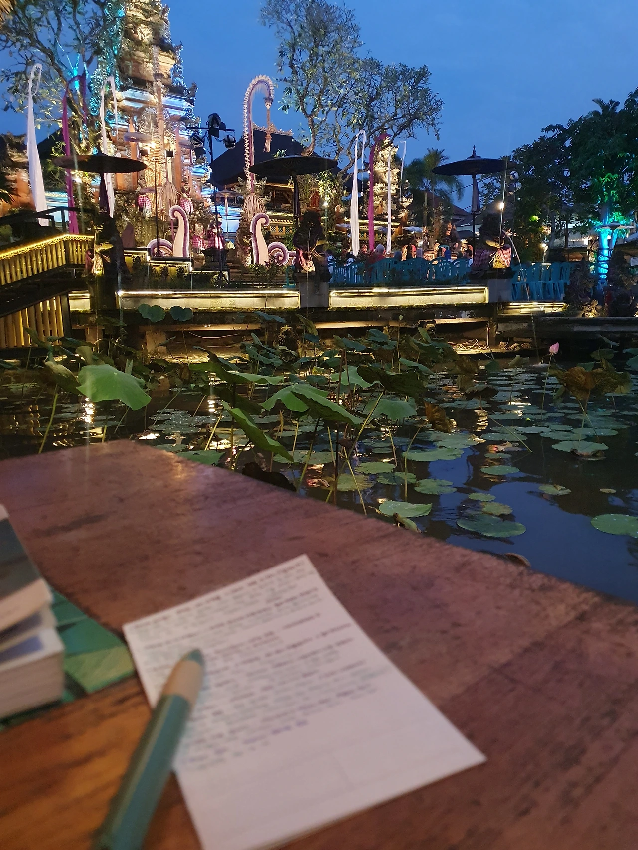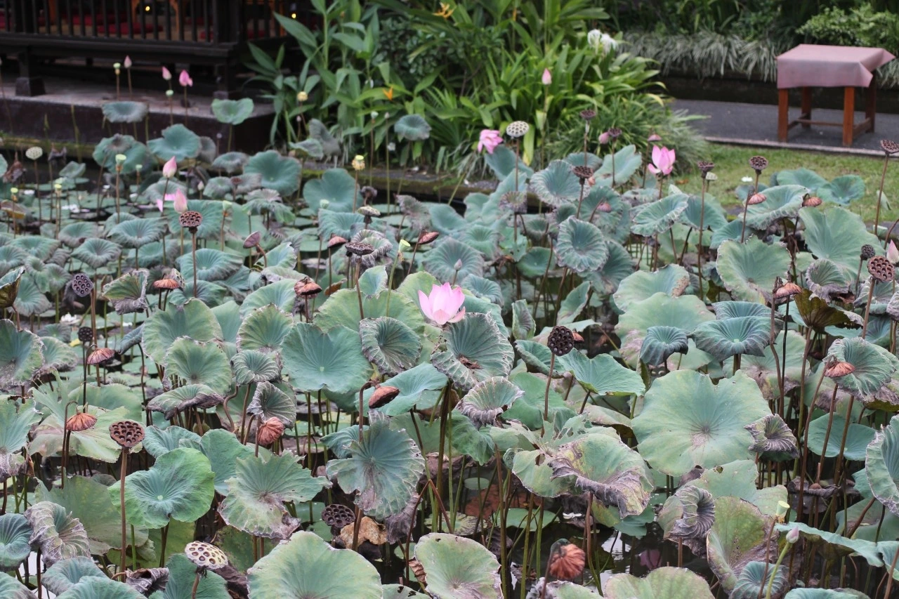 고민 고민하다 결국 서핑캠프 매니저님께 사정을 말씀드리고 우붓으로 가는 차를 예약해 주실 수 있는지 여쭈어보았다. 매니저님은 우붓을 버스 타고 이동할 생각을 한 나의 용기가 대단하다는 말과 함께, 흔쾌히 차를 예약해 주셨다. 밴을 타고 우붓으로 오게 될 줄은 상당도 못 했지만, 서로의 몸에 자신의 줄기를 얽히고설킨 나무들이 보이기 시작하니 우붓에 왔다는 게 실감 났다. 숙소에 짐을 내리고, 우붓에서 마지막으로 방문했던 연꽃사원을 찾아보았다. 사원으로 향하는 양 옆에 연꽃이 피어있고, 고즈넉하면서 세월의 흔적이 묻어있는 소품들과 건축물이 잘 어우러져 더없이 아름다운 곳이었다. 그때는 이름도 몰랐는데, '사라스바티'라는 이름을 가진 사원이었다.