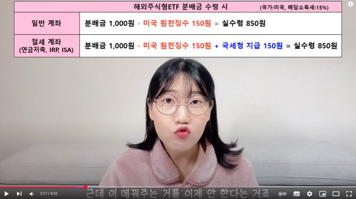 (투자 수익에 즉시 세금을 내지 않고 만 55세 이후 연금 수령 시점에 3.3~3.5% 낮은 세율만 적용됨, 하지만 올초 해외주식형 ETF 배당금에 대해서는 15% 정도 과세하는 것으로 법이 바뀜.-내가 좋아하는 할미언니 유튜브 화면 캡처~!)