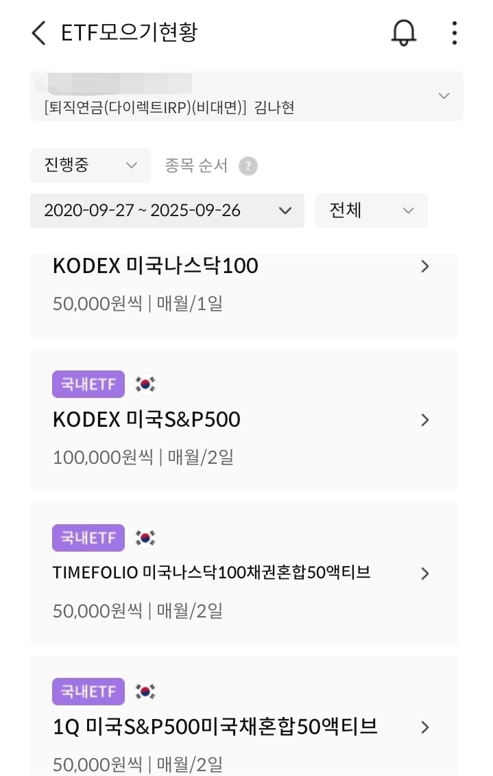 #4 종목당 모으는 금액을 설정한 기준은, 비슷비슷한 비율로 나누고, 연금저축의 경우에는 600만 원을 12개월로 나누어 매달 50만 원 ETF 모으기를 했고, IRP의 경우에는 300만 원을 12개월로 나누어 매달 15만 원씩 ETF 모으기를 신청해 두었다.