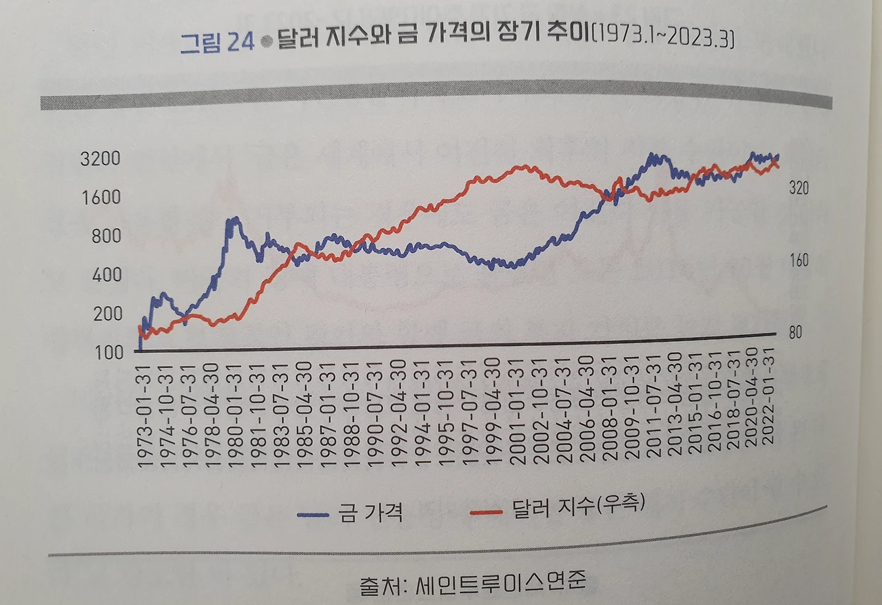 (대체투자 자산에는 금, 원유 같은 원자재나 부동산 등이 있다. 가장 잘 알려진 금은 달러와 음의 상관관계를 가져 포트폴리오 내 달러 자산의 변동성을 줄여줄 수 있다.)