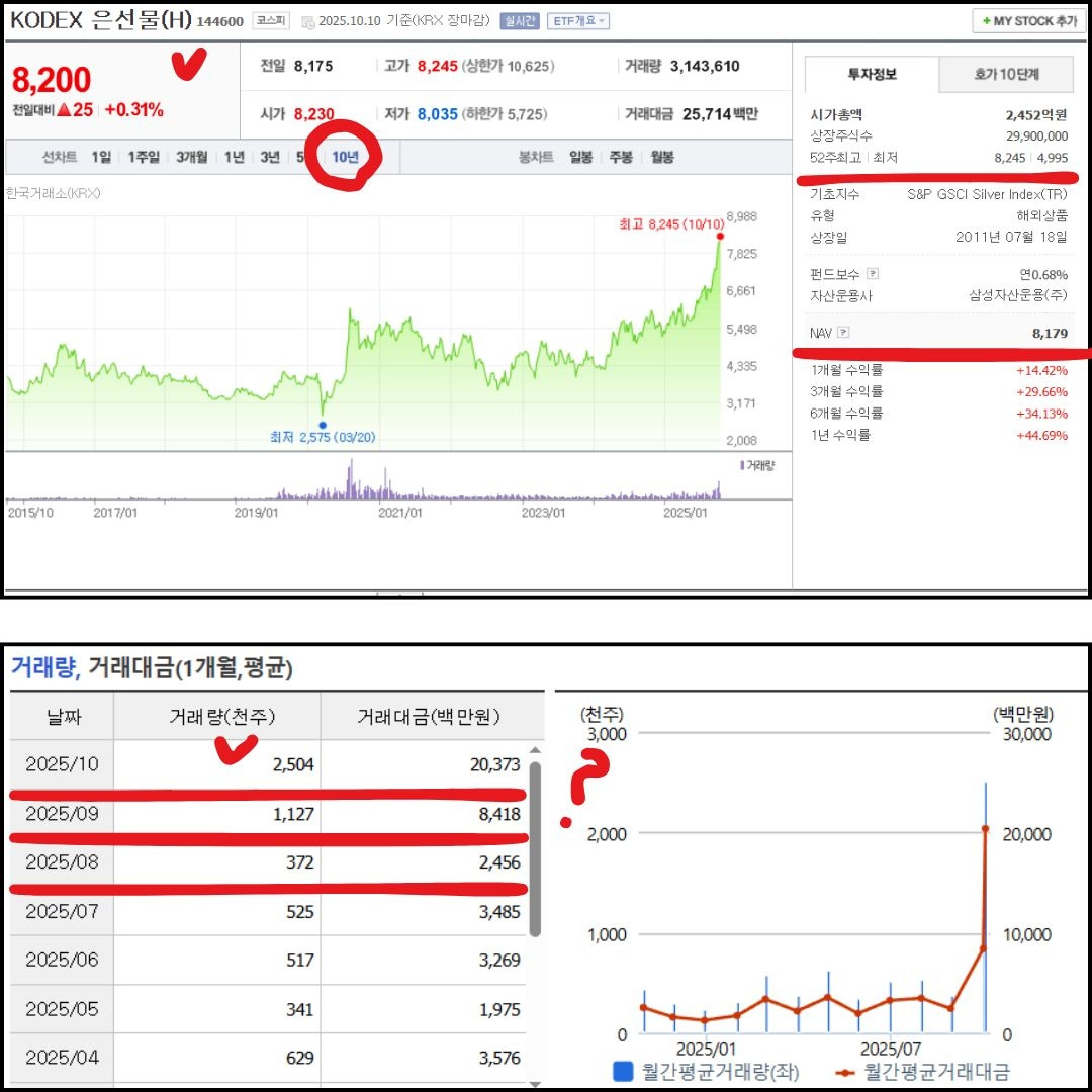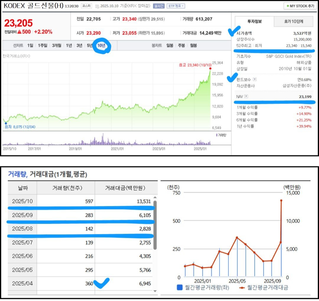 그렇다면, 위의 기준들을 바탕으로 이전 글에서 고민했던 금, 은 ETF를 사야 하는지, 지금이 고점인 것인지 한 번 살펴보자.