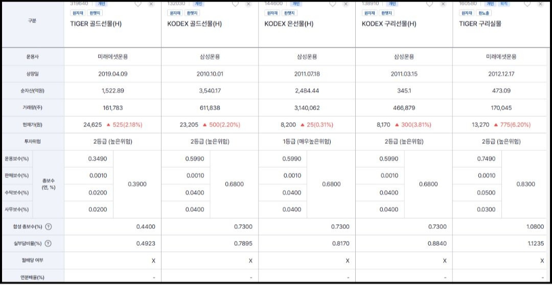 FUNETF에서 금, 은, 구리를 검색해 보았다. 그런데 여기서 나를 당황하게 한 용어들이 등장했다. '선물', '현물', '실물'....!!! 그냥 S&P500이나, 나스닥 100처럼 '금', '은', '구리' 이렇게 있으면 좋으련만 새로운 개념이 등장했다. 새로운 개념은 다음에 다시 공부해 보기로 하고, 우선 지난 'ETF 처음공부'책에서 K-올웨더 포트폴리오에 적혀있었던 금 ETF 두 개와 비슷한 은, 구리 ETF를 선택해서 비교해 보았다.