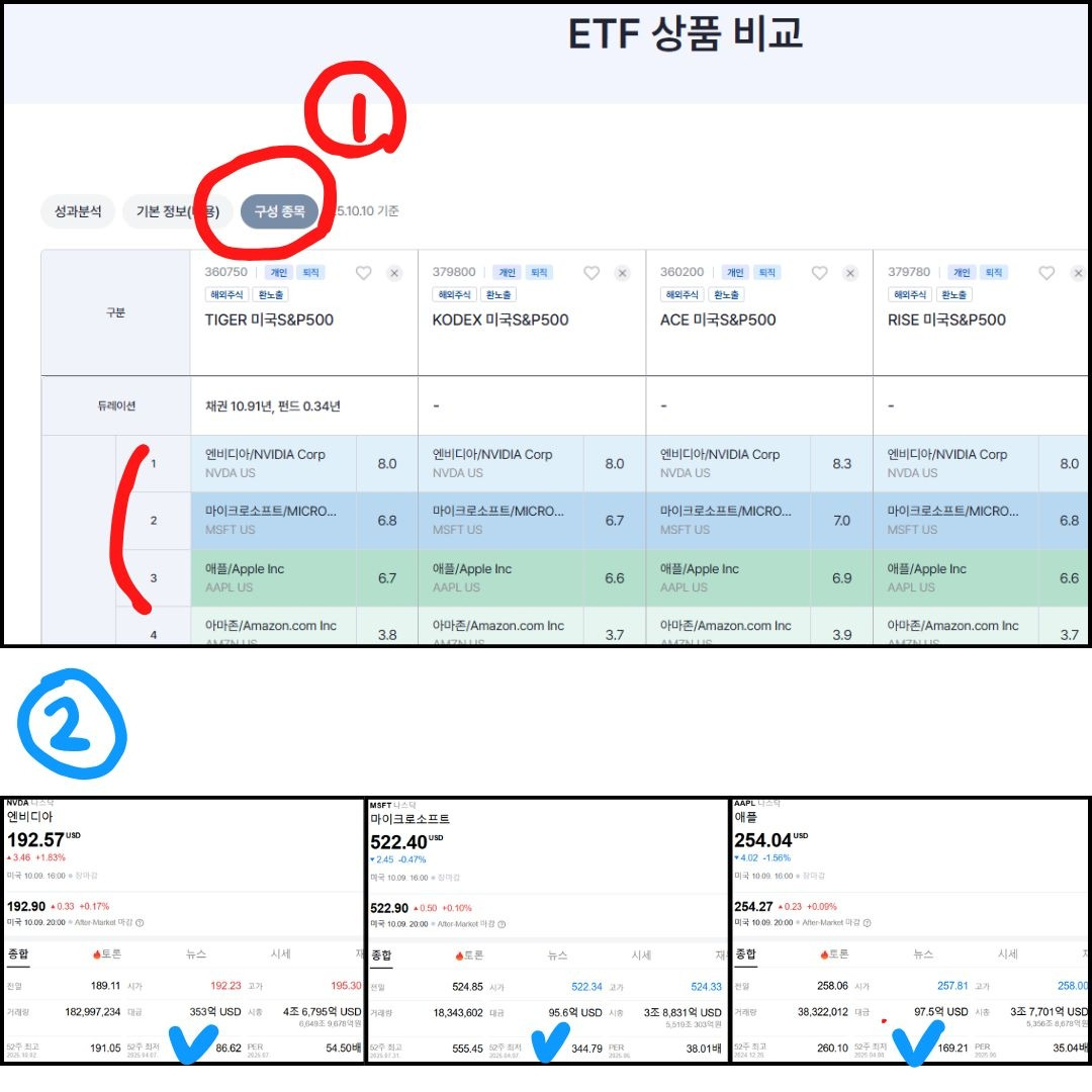 나는 ① FUNETF를 활용해서 내가 선택한 ETF의 구성종목을 살펴보았고, ② 네이버증권을 활용해 각 항목의 PERD을 확인해 보았다.