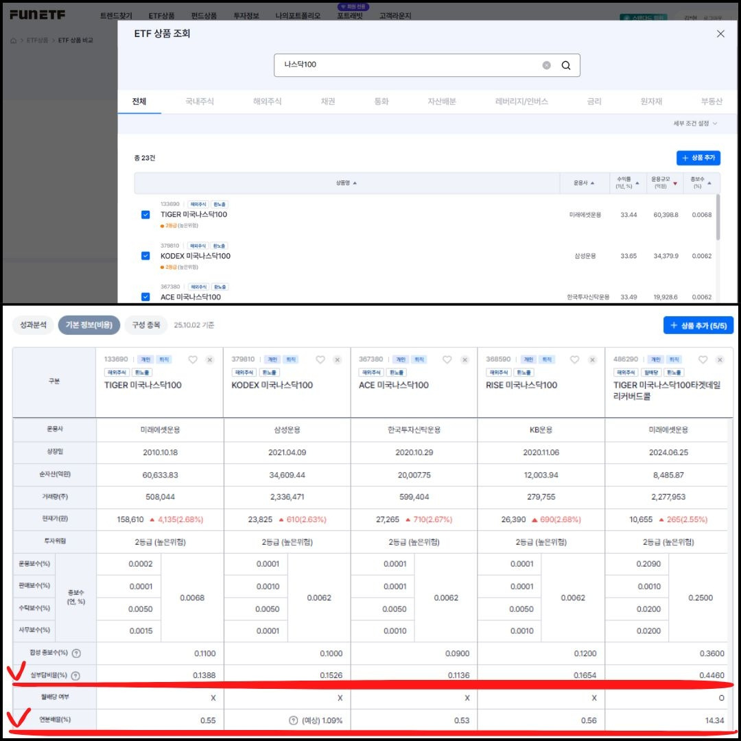 네이버증권 화면에서는 운용보수나 연분배율을 한눈에 비교하기 어려워서 FUNETF 사이트를 활용하면 조금 더 쉽게 비교할 수 있다. 가장 대표적인?! S&P500 지수를 추종하는 ETF들과 나스닥 100 지수를 추종하는 ETF를 비교해 보았다. ( https://www.funetf.co.kr/ )