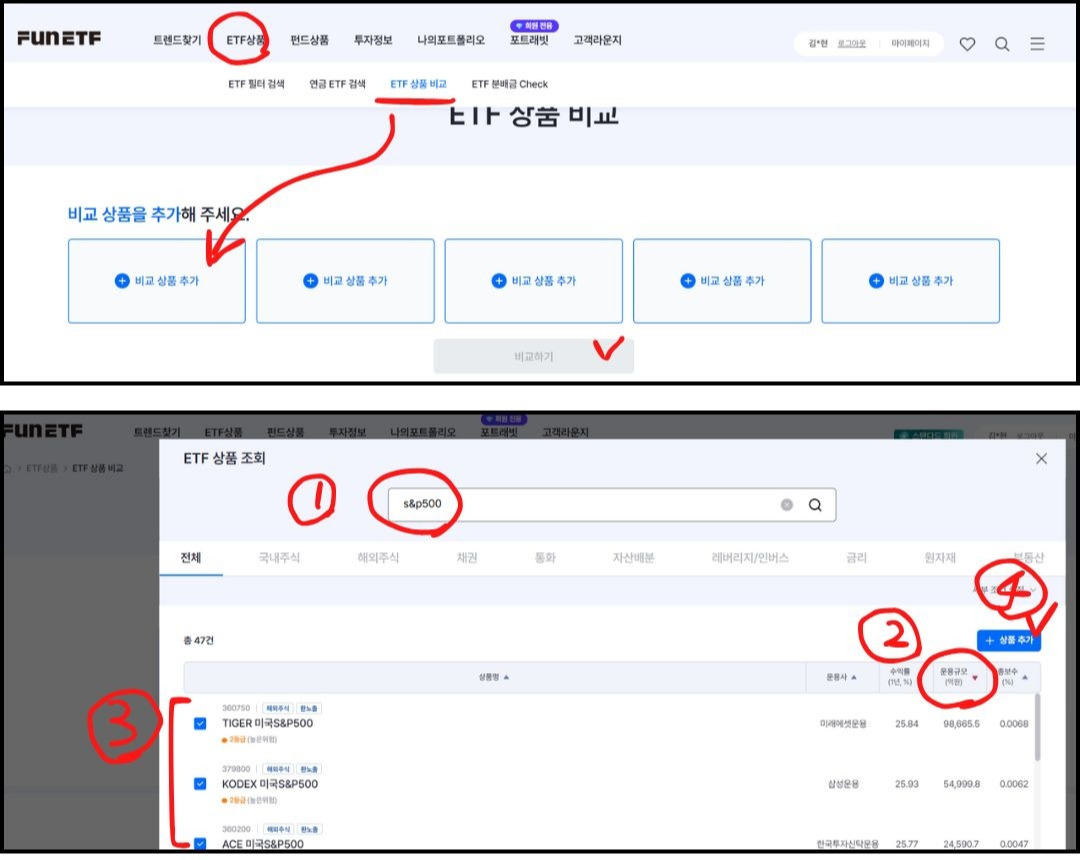 FUNETF 사이트에 들어가서, ETF상품 비교를 클릭하고, 비교상품추가를 클릭한 다음 ① 내가 원하는 ETF 기초지수를 적는다. ② 운용규모가 큰 상품 위주로 선택할 예정이라(나의 투자 성향은 다소 보수적이다^^;;) 운용규모 큰 순서로 정렬하고 ③ 상위 5개까지 비교가 가능하므로, 5개 체크박스에 체크한 다음에 ④ 상품추가를 클릭하면 한눈에 내가 선택한 상품을 비교해서 살펴볼 수 있다.