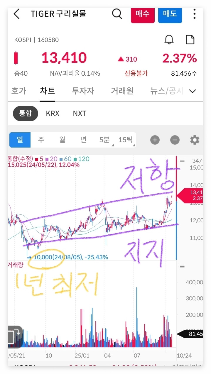 나의 경우에도 TIGER구리실물 ETF를 구매하고 난 다음 바로 1~2일 후에는 마이너스 수익률이었다. 차트를 보니 지지와 저항선이 보이는 듯해서, 나는 13000원에 구매했지만 대략 10000원까지 내려갈 수도 있겠다는 생각이 들었다. (-20%까지 가격이 하락할 수도 있겠다는 생각이 들었다.) 만약 그보다 더 아래로 내려간다면, 그때는 '위험' 경보이지 않을까 하는 생각이 들었고 빠르게 처분하기로 마음먹었다. 그래서 내가 구매한 시점 이후에 -10% 가격인 12000원, -20% 가격인 10000(10400원)이 되면 추가 매수를 하기로 마음먹었다.