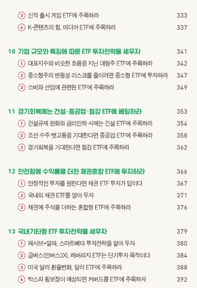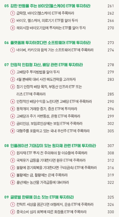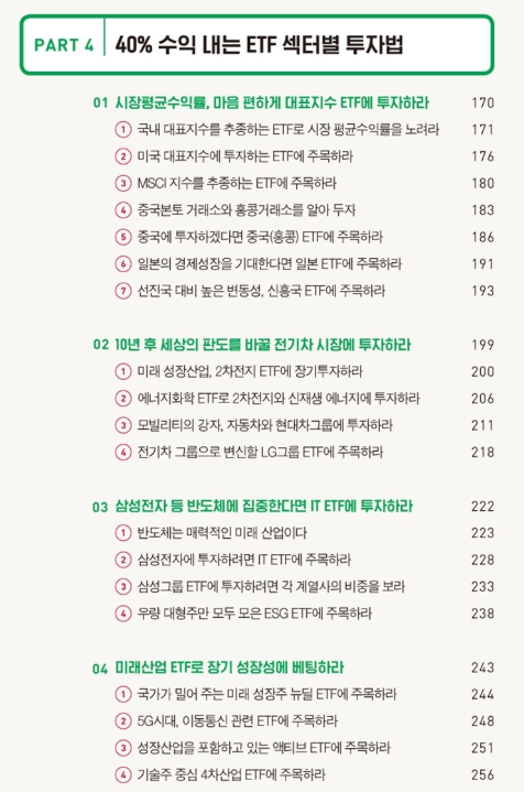 이 책의 후반부에는 연금 계좌와 40% 수익 내는 ETF 섹터별 투자법이 나와있다. 경제 상황에 따라서 어떤 종목에 투자하면 좋을지 조언을 해 주는 부분이다. 이 부분은 목차를 소개하는 것으로 대신한다. 책 속에 차마 글로 소개하지 못한 깨알 정보와 꿀팁들이 많으니, ETF 주식 투자에 관심이 많은 분들이라면 한번 즈음 읽어보기를 권한다.