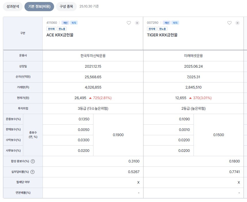 FUNETF 사이트에서 금현물을 검색하니 ACE 금현물과 TIGER 금현물이 등장했다. 이 두 ETF를 비교해 보니, 자산 규모가 크고 실부담비율이 낮은 ACE KRX 금현물을 구매해 보기로 했다.