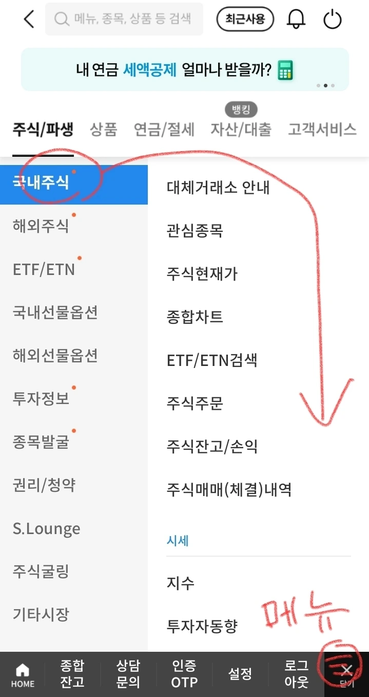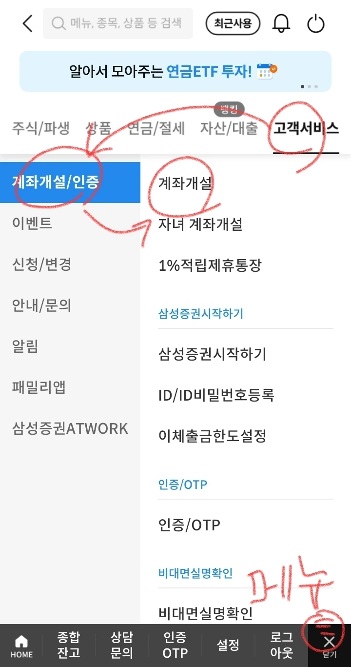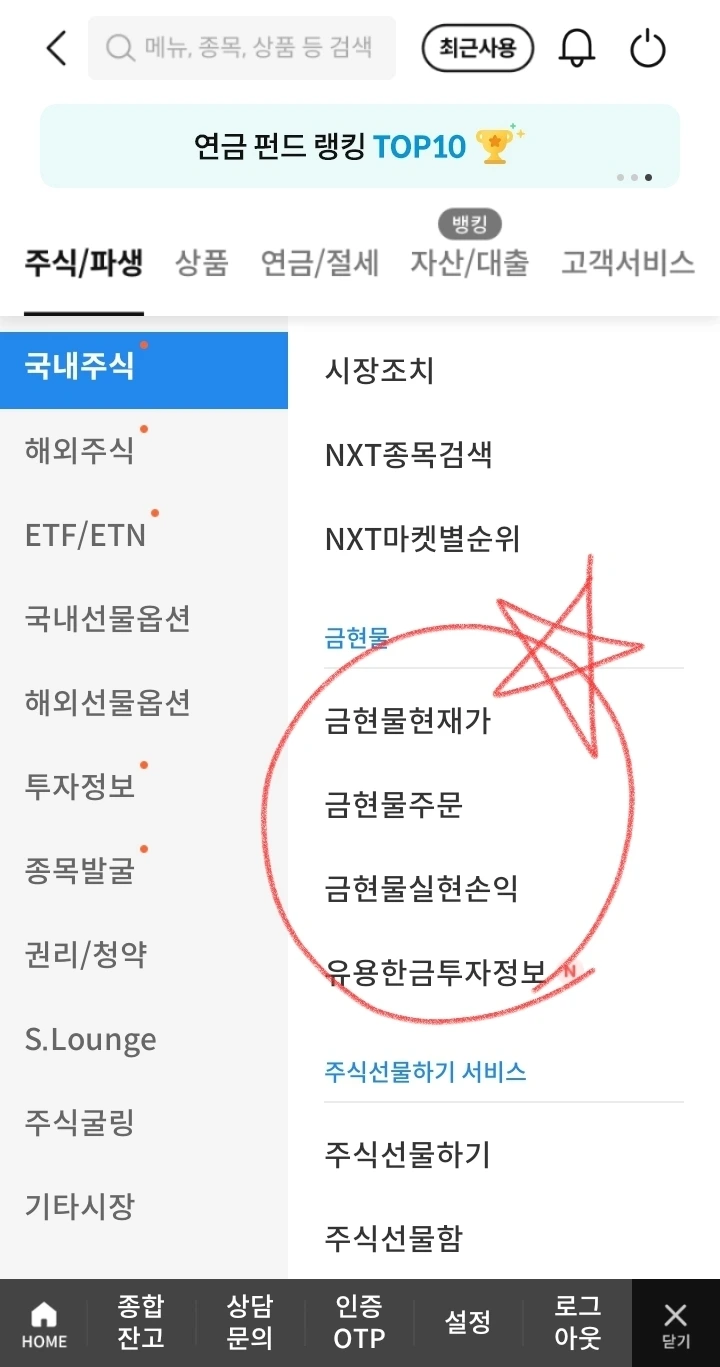 주식 어플에서 (동그라미 안에 삼선이 그려져 있는) 메뉴 버튼을 누르면 고객서비스 란이 보인다. 여기에서 '계좌개설/인증', '계좌개설'을 클릭! 그러면 아래로 쭉쭉 내렸을 때 '금현물'이 등장한다. 여기를 클릭해서 KRX 금현물을 거래할 수 있는 계좌를 만들면 된다.