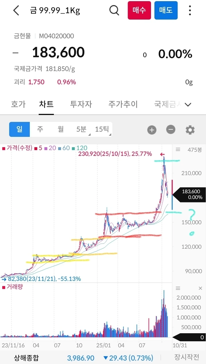 금현물을 주문하기 위해서는 삼성 mop을 기준으로, 메뉴를 선택하고 국내주식란에서 쭉쭉 아래롤 내려가다 보면 '금현물 주문'란이 보인다. 현재가도 확인할 수 있으므로, 가격을 먼저 체크하고 주식과 똑같이 주문을 하면 된다. 내가 못 찾은 것인지 모르겠으나, KRX 금현물 거래는 주문을 예약할 수 없었다. 내가 주식 어플을 살펴본 시간은 장 거래 시간이 끝난 이후였으므로, 당장 구매하지는 못 하고 얼마 정도가 되면 구매할까 고민을 해 보았다. 주식 차트를 정확하게 볼 줄 아는 것은 아니나, 살펴보다 보니 어떤 '규칙'이 보였다.
