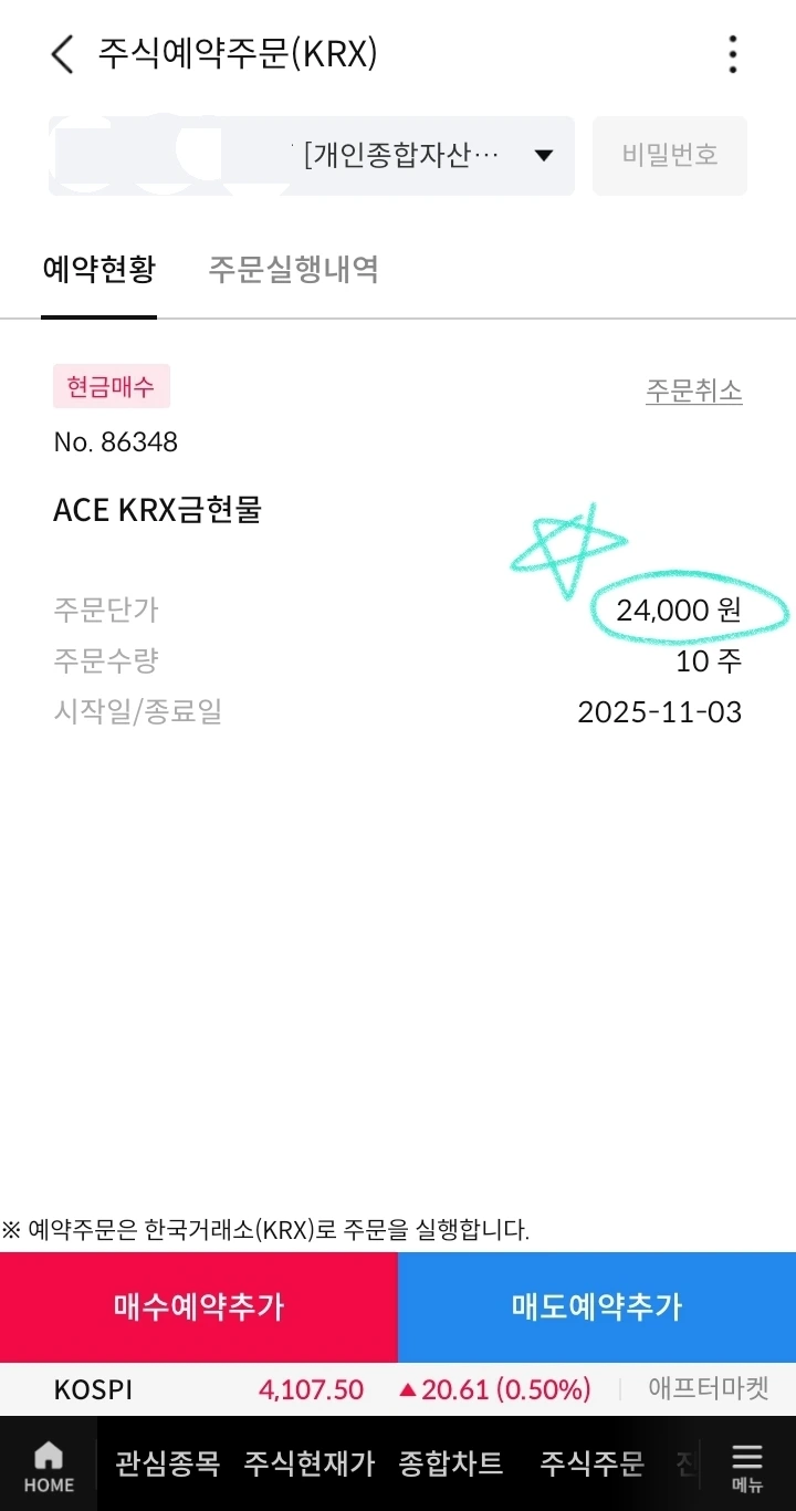 그러면 그 사이를 왔다 갔다 하는 과정에서 가장 적당한?! 가격으로 구매를 하면 좋겠다는 생각이 들었다. 현재 민트색 구간의 가장 높은 가격은 32000원대이고, 그전 빨간색 구간의 가장 높은 금액은 23000원대이다. 현재 가격은 26000원 정도인데, 그 사이 가격 24000원이나 25000원 정도에 사면 괜찮지 않을까 하는 생각이 들었다. 1000원이라도 싸게 구매해 보고픈?! 마음에 우선 24000원을 매수 예약해 두었다.