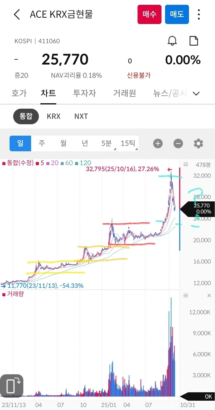 ACE 금현물 ETF에도 비슷한 경향이 보였다. 당연한 것이 ACE 금현물 ETF의 경우 KRX 금현물 지수를 따르기 때문에 그 그래프가 비슷한 모양을 하고 있는 것이다. 금현물 그래프와 똑같이 연한 노란색 구간에서 횡보하다가, 진한 노란색으로 점프하고, 그다음 빨간색 라인으로 점프한 다음 그 사이를 왔다 갔다 하고 있다. 지금 민트색 구간으로 점프한 상태고 이제 이 사이를 왔다 갔다 하지 않을까 하는 생각이 들었다.