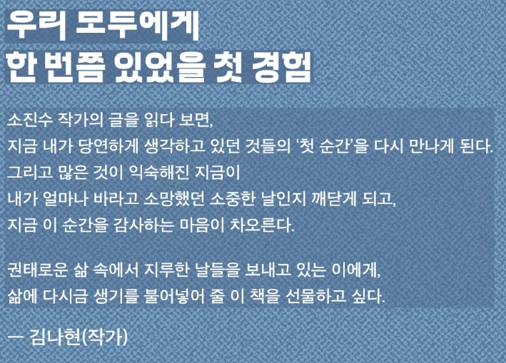 : 저도 글을 읽으면서 저의 '처음'들이 많이 떠올랐어요. 첫 제목보다 새로 지은 제목이 책의 내용을 더 잘 담아내는 것 같습니다.