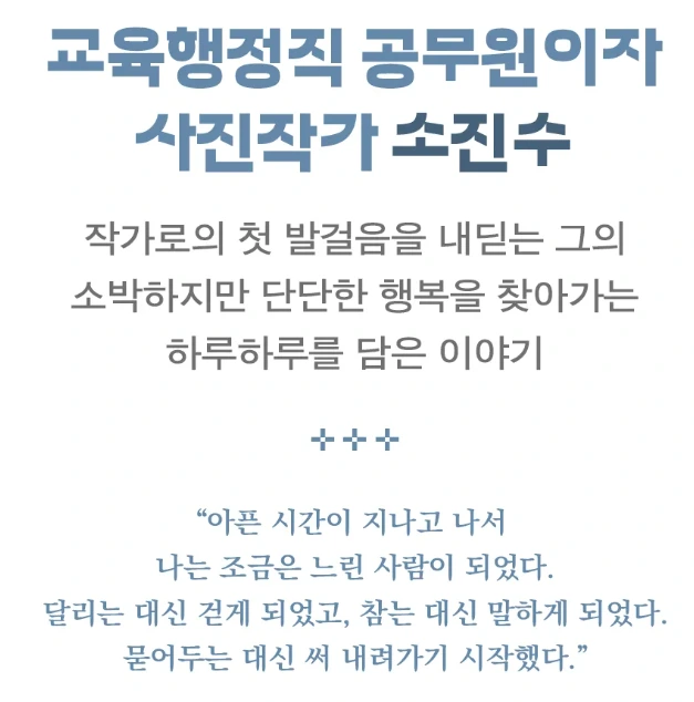 : 저희 집에 남편 친구들이 놀러 온 적이 있는데, 친구가 책장에 꽂힌 책 중에서 '행복의 진수'(소진수 작가의 첫 책)을 보더니 "와, 이 책은 종이 질이 정말 좋다. 이 값에 팔면 오히려 적자일 것 것 같은데?"라고 말했다고 해요. 그만큼 책을 만드는 과정에서 무엇 하나 허투루 하지 않고 최선을 다 하시는 성격이신데, 이번 책에서도 그런 정성들이 글에 녹아있는 것 같아요.