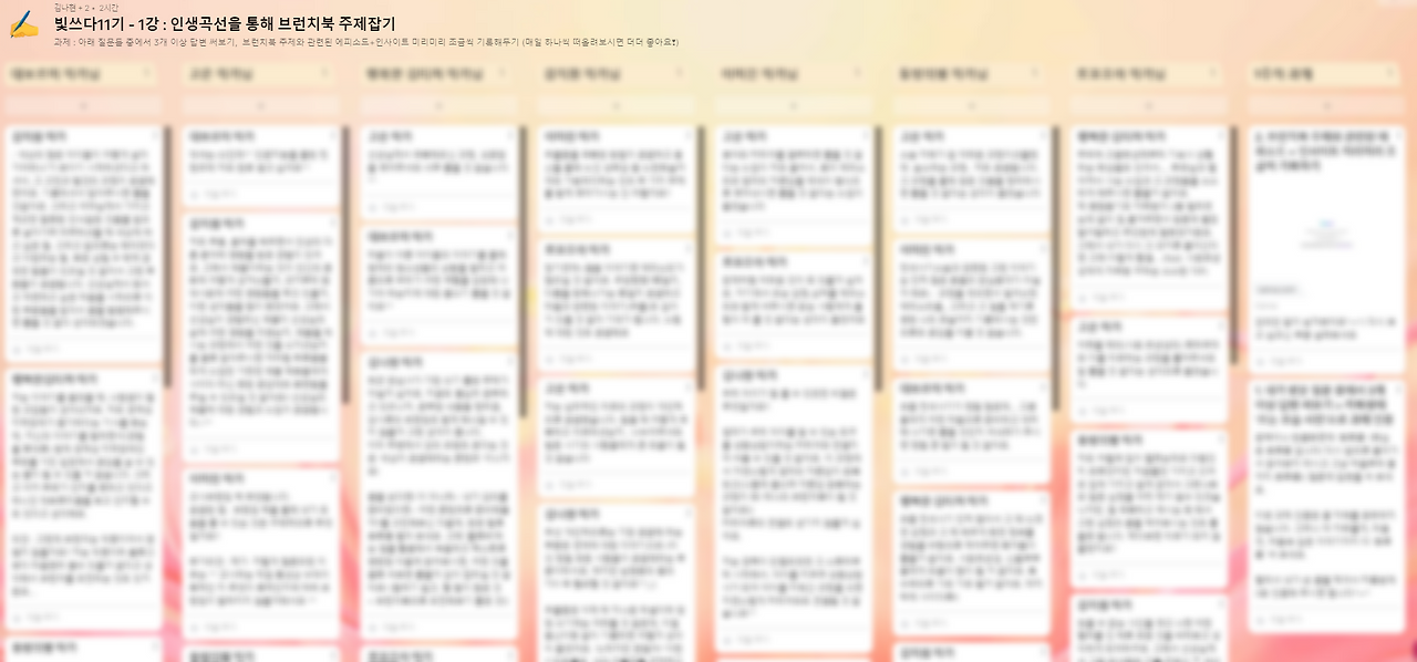 모임 공지를 올리고 난 다음에는 항상 두려움과 설렘으로 가득 차요 그렇게 며칠 지나고 났는데도 신청하는 사람이 없으면 '너무 일정이 빡빡했나?' , '보증금을 너무 많이 책정했나?' 하면서 마음이 쪼글쪼글 해져요 자신감이 쭉 ㅡ 떨어지면서 '내가 뭘 하겠다고 그랬을까' 막 이런 생각도 들고요. 그런데 정말 감사하게도 그동안 빛쓰다를 함께 해오면서 브런치북을 도전해보고 싶으신 작가님께서 신청해 주시기도 하셨고, 코칭을 공부하며 알게 된 작가님께서도 신청해 주시고, 다른 플랫폼에서 급하게 공지를 올렸는데 모집인원이 기대한 것 이상으로 꽉 차서 감사한 마음으로 첫 줌 미팅을 가졌어요.