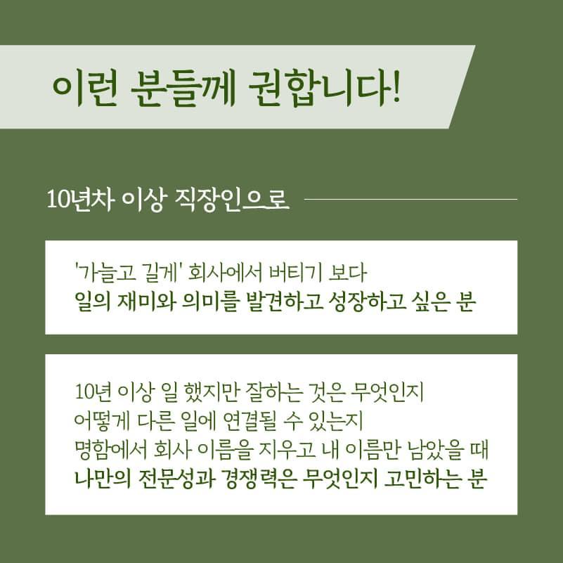 •10년 이상 일 했지만 나의 일의 경험에서 막상 잘하는 것은 무엇인지, 어떻게 다른 일에 연결될 수 있는지, 명함에서 회사 이름을 지우고 내 이름만 남았을 때 나만의 전문성과 경쟁력은 무엇인지, 어떻게 정리해야할지 고민하는 분