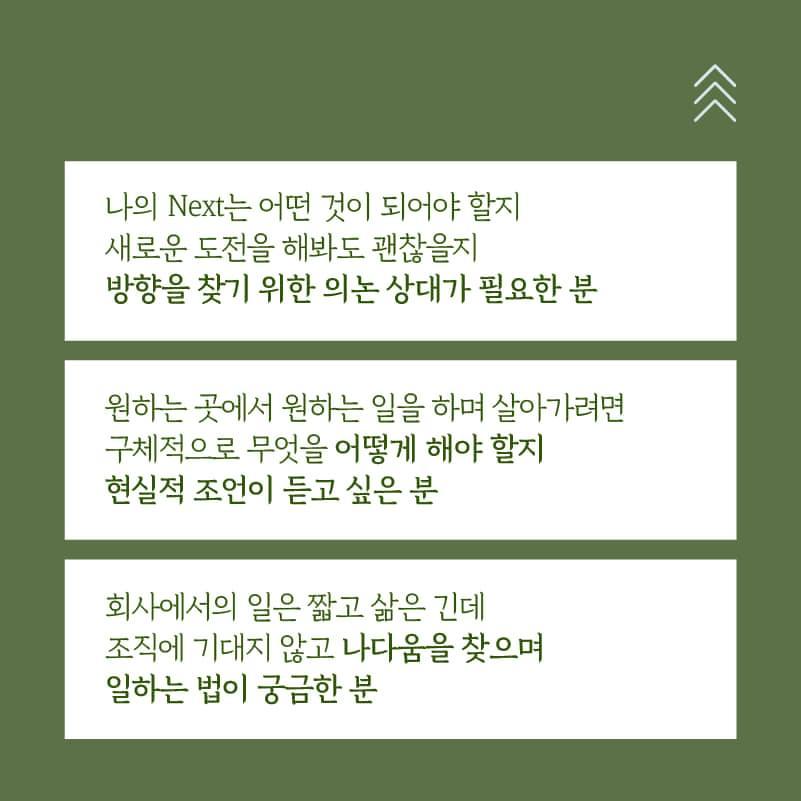 •나의 Next는 어떤 것이 되어야 할지, 새로운 시도를 위한 도전을 해봐도 괜찮을지, 명확한 답이 없는 고민들 끝에 방향성을 찾기 위한 의논 상대가 필요한 분