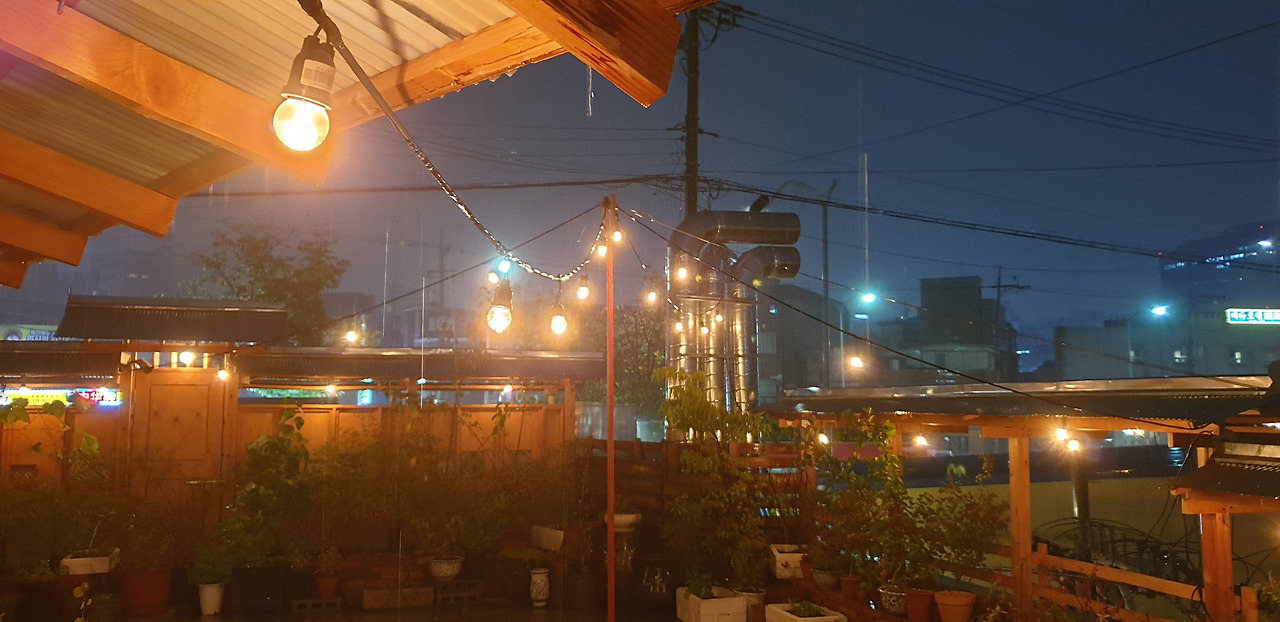 이보다 더 좋을 수 있을까. 빗방울이 산산이 부서지는 광경과 소리들이 옥상을 가득 메우니 술 한잔 하던 다른 테이블의 처자들이 하나 둘 옥상으로 올라와 폰을 꺼내 들어 촬영에 들어갔다. 덕분에 이쁜 처자들을 바라보는 서비스는 바라지도 않았던 덤이었다.