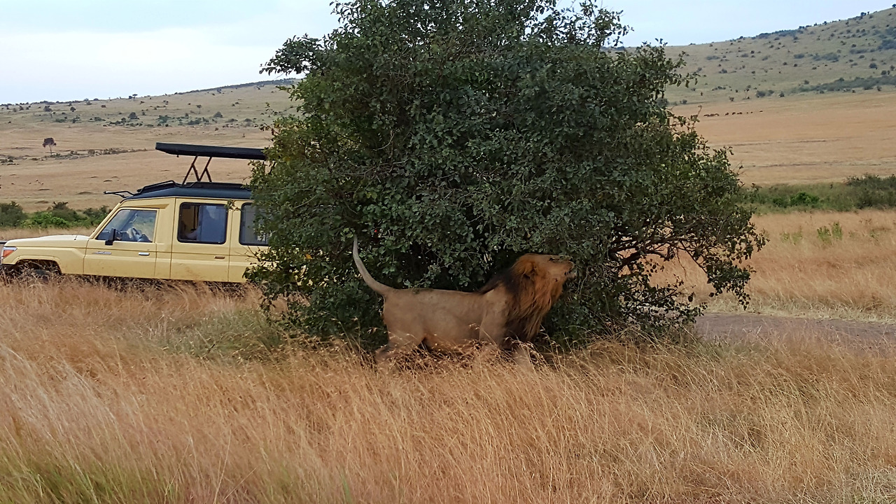 그때 숫사자 한 마리가 나무 뒤에 있다가 우리 차량으로 다가오기 시작했다. 가까이서 보는 사자의 몸집은 생각보다 더 컸으며, 드라이버의 '쉿'이라는 소리에 모두가 숨을 죽이고 사자가 지나갈 때까지 조용히 기다렸다. 뛰면 지붕까지도 오를 수 있다는 사자는 큰 몸집만큼 걸음은 느릿하지만, 아우라는 모든 사람들 숨죽이게 하기 충분했다.