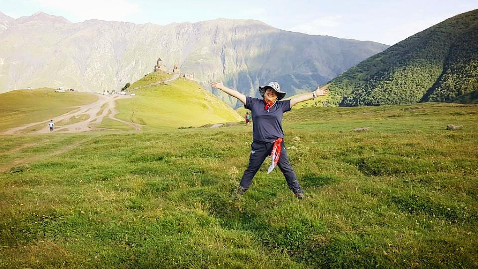 주차장으로 내려오면서 자전거가 보인다. 우와~ 이런 험한 곳을 자전거로? 누군지 모르지만 대단하다. 나보고 하라면 못한다. 난 그냥 지프타고 다시 내려간다. 성당을 구경하고 내려오면서 성당과 카즈베기를 배경으로 사진을 찍어본다. 초록색을 펼쳐진 드 넓은 풀밭, 언덕 위에 도도하게 서있는 수도원, 깎아지른 바위산 등 사방이 그림이다.